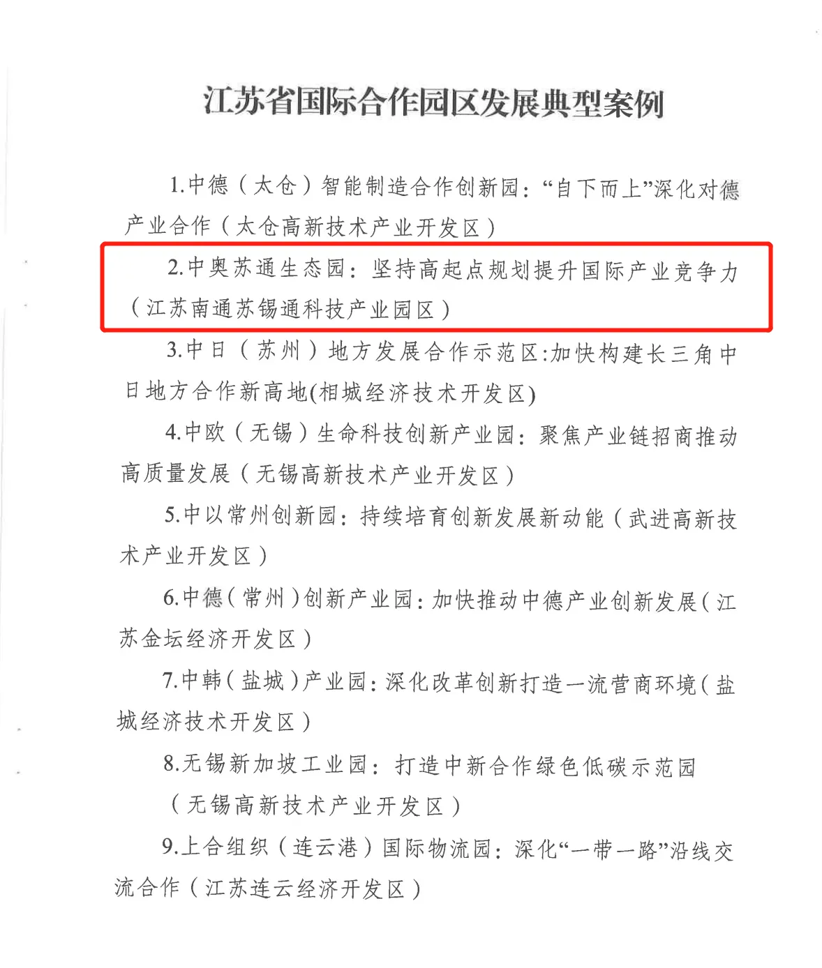 为进一步推动全省国际合作园区加快高质量发展、加速对外开放,近日,江苏省商务厅下发了《省商务厅关于印发江苏省国际合作园区发展案例的通知》,在全省范围内选取了9个在特定国别合作、特定国别项目招引、完善合作机制方面成效突出的典型园区进行推广。苏锡通园区中奥苏通生态园顺利入选,是南通市唯一入选园区。