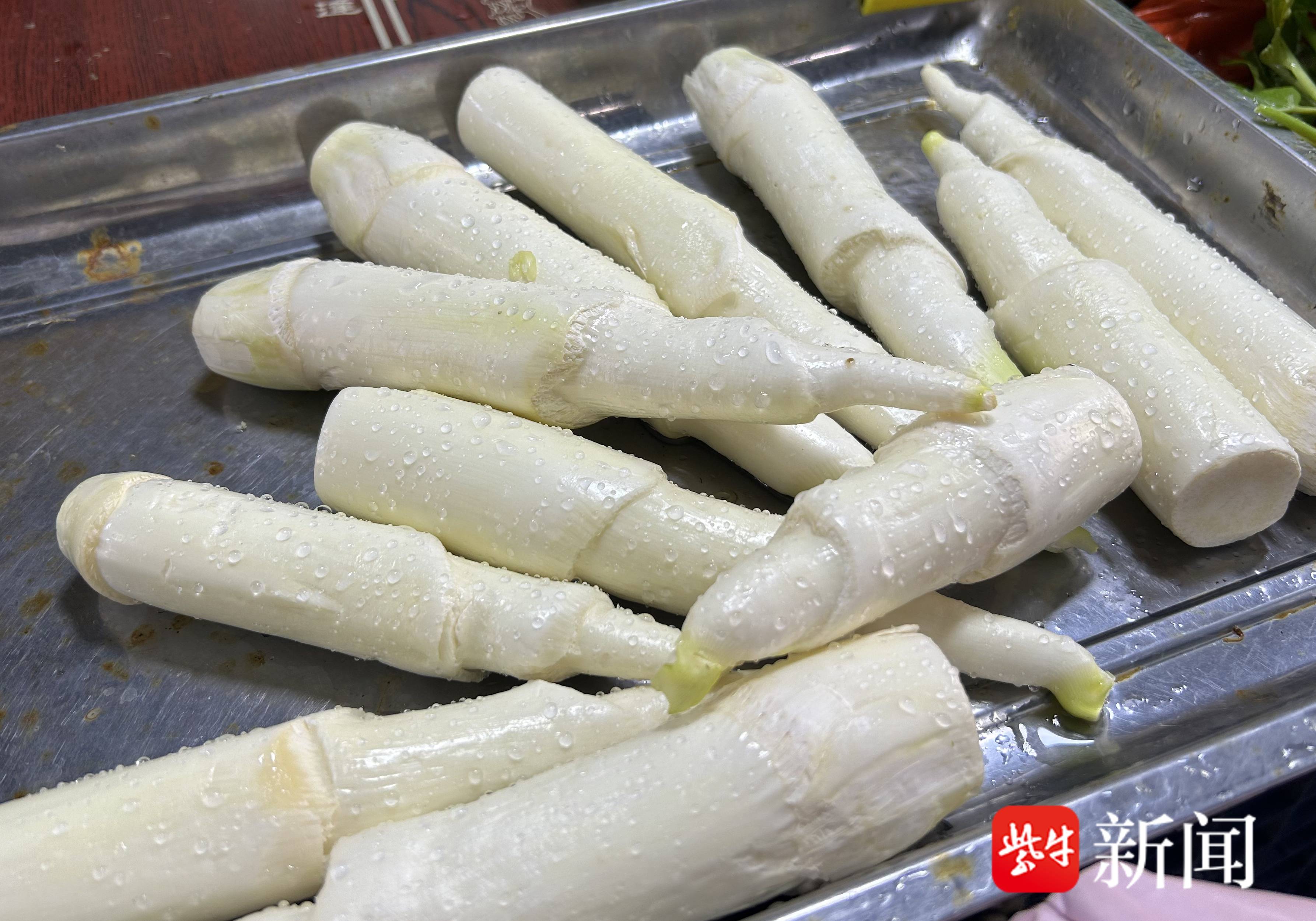 珠泉农贸市场里,新剥的茭白是每个摊位上的主角。茭白一般一年两熟,眼下新上市的茭白正是鲜嫩的时候,莹白的肉质仿佛能一下子掐出水来。挑茭白也可以看看它的根部,如果根部掐不动,或者根部掐开以后有较硬的木质纤维,说明它比较老了。南京人喜欢把茭白叫做茭瓜,也有些地方因为它形似笋而叫它茭笋,实际上它既不是瓜也不是笋,而是植物菰被黑粉菌感染后茎部形成的肉质茎。它不仅具有鲜、嫩、脆、软多种丰富的口感,还富含纤维素、淀粉、蛋白质等营养成分。茭白最家常的吃法是炒肉丝,眼下剥干净的茭白卖7元一斤,记者买了两根不到4元,加肉丝刚好够炒一盘的量。
