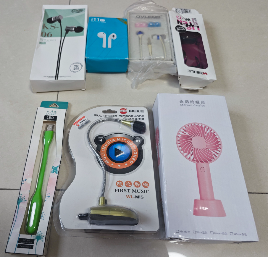 记者以39.95元的价格在该店下单购买了一千克海外盲盒,并要求客服备注全要海外件。收到快递包裹后,里面塞着三个封着的快递袋,袋里有两个插线耳机、两个蓝牙耳机、一个LED灯、一个手持风扇和一个麦克风。