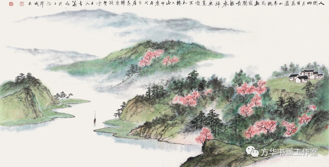 远山近石、远水近泉、远帆近屋,青山隐隐绿水迢迢的江南山水,在方华的笔墨中宛如江南吴语的轻柔,令人心动;又似空气中若有若无的泥土芬芳,沁人心脾。画卷上那种诗意般的浪漫,让人联想到定都南京的南朝后主李煜魂牵梦萦的吟咏:“闲梦远,南国正芳春。船上管弦江面渌,满城飞絮辊轻尘。忙杀看花人!”