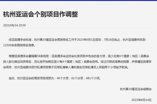 8月14日,杭州亚组委官方宣布,取消轮滑项目男子花样轮滑单人滑和混合花样轮滑双人舞蹈两个小项。