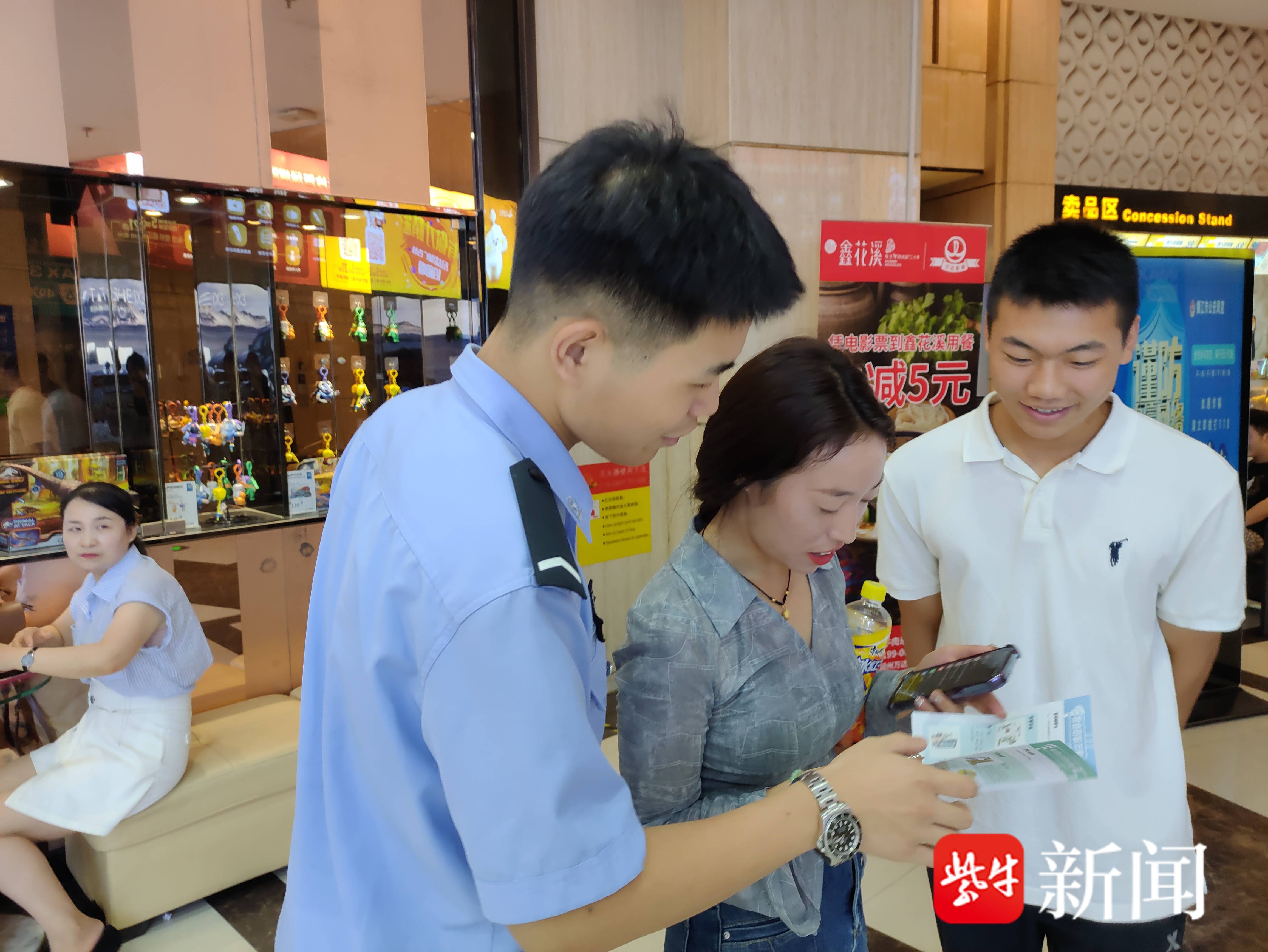 在影院现场,民警通过发放反诈素材手扇、宣传册,与前来观影的观众互动交流并展开有奖问答:“遇见电信诈骗应该怎么办?”“常见的诈骗类型有哪些?”同时,发放精美小礼品等方式来普及防范电信网络诈骗相关知识,呼吁大家增强识骗防骗能力。