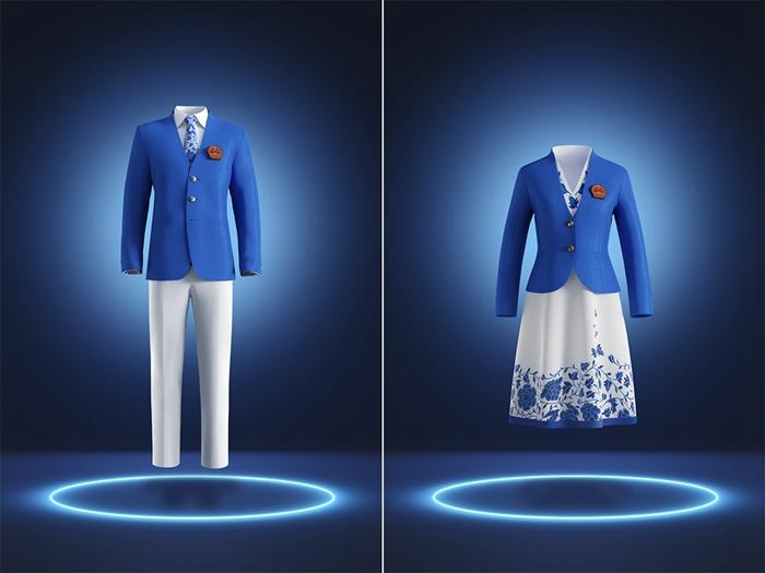 本次礼服命名为“星耀”,白与蓝的主色调碰撞出闪耀星辰与深邃宇宙的遐想,锁甲纹环环相扣,牡丹与藤蔓交织,绽放着蓬勃生命力,China字母金属扣和独特的颈部半立领设计,彰显中国文化魅力。