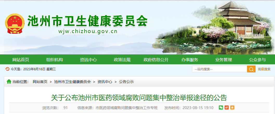 同日,池州市医药领域腐败问题集中整治工作专班发布公告,公布了池州市医药领域腐败问题集中整治举报途径。