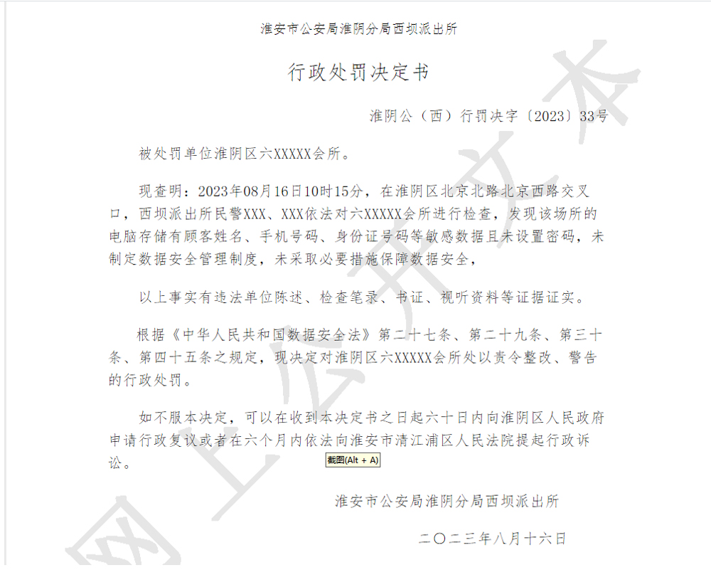 记者注意到,这份由淮安市公安局淮阴分局西坝派出所作出的行政处罚决定书(以下简称决定书)日期为8月16日,记者通过江苏公安执法公示平台查询得知,该份决定书上网时间为8月19日。决定书内容显示:2023年8月16日10时15分,在淮阴区北京北路北京西路交叉口,西坝派出所民警依法对某会所进行检查,发现该场所的电脑存储有顾客姓名、手机号码、身份证号码等敏感数据且未设置密码,未制定数据安全管理制度,未采取必要措施保障数据安全。以上事实有违法单位陈述、检查笔录、书证、视听资料等证据证实。根据《中华人民共和国数据安全法》第二十七条、第二十九条、第三十条、第四十五条之规定,现决定对淮阴区某会所处以责令整改、警告的行政处罚。如不服本决定,可以在收到本决定书之日起六十日内向淮阴区人民政府申请行政复议或者在六个月内依法向淮安市清江浦区人民法院提起行政诉讼。
