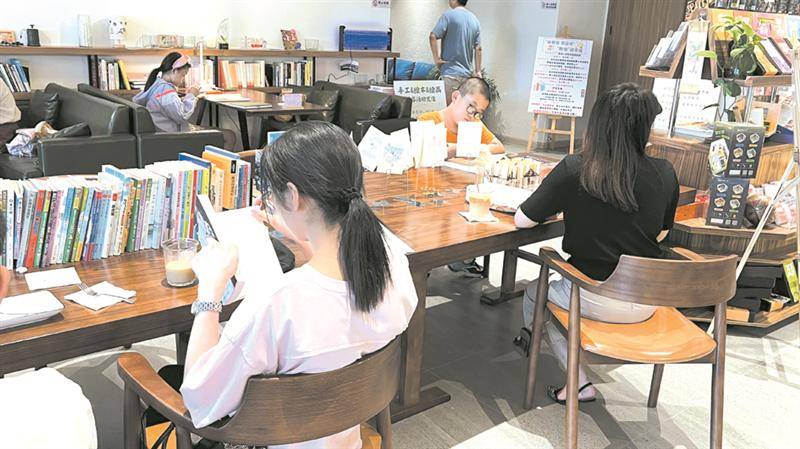 晚上8点半,万科一社区24小时自助图书馆内有十几人正在安静地看书学习。临窗的吧台上,杨女士戴着降噪耳机刷着一级建造师的题,自从6月在附近吃饭时偶然发现了这间“宝藏”图书馆后,她几乎每晚都会过来学习三四个小时。宋女士带着儿子和女儿一起学习,她在备考驾照理论考试,孩子们则在一边做暑假作业、看漫画书。