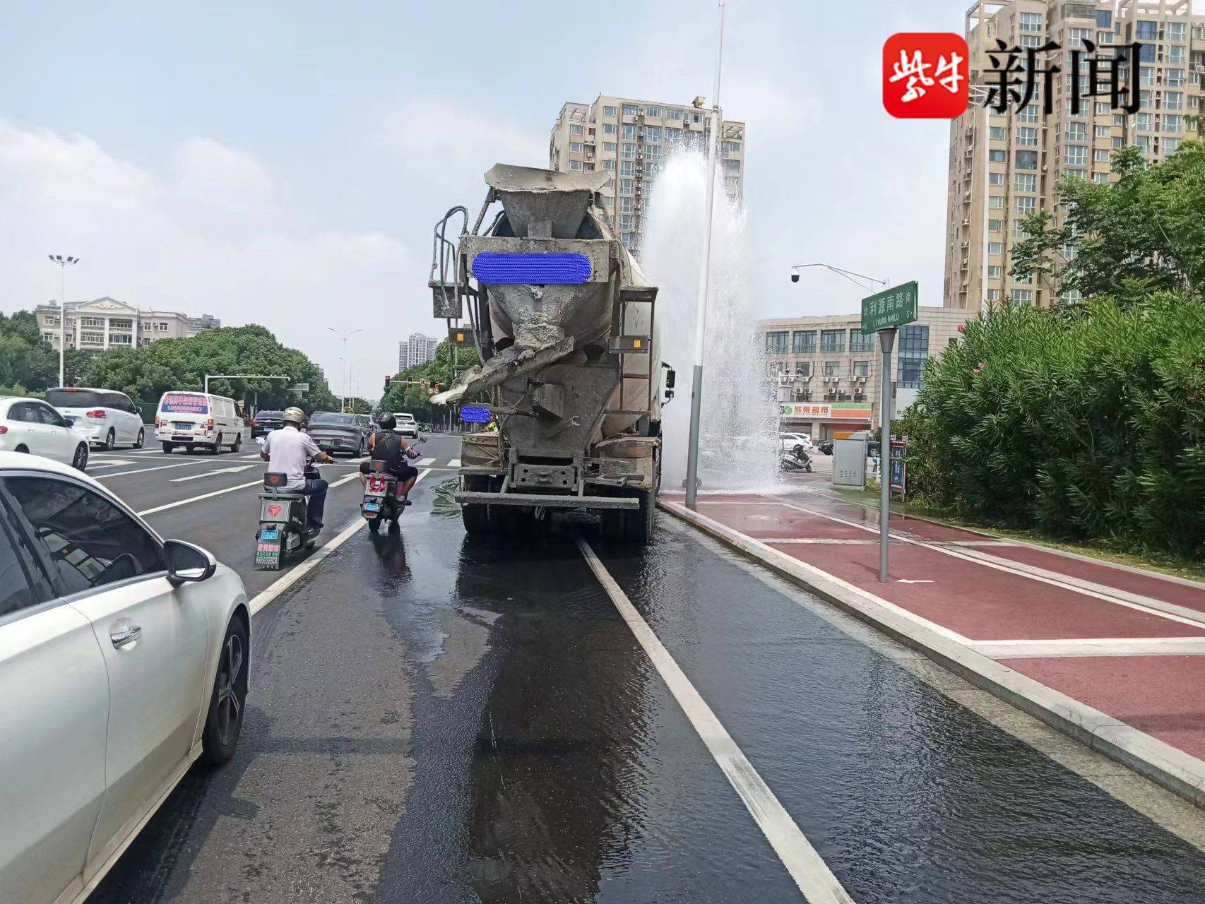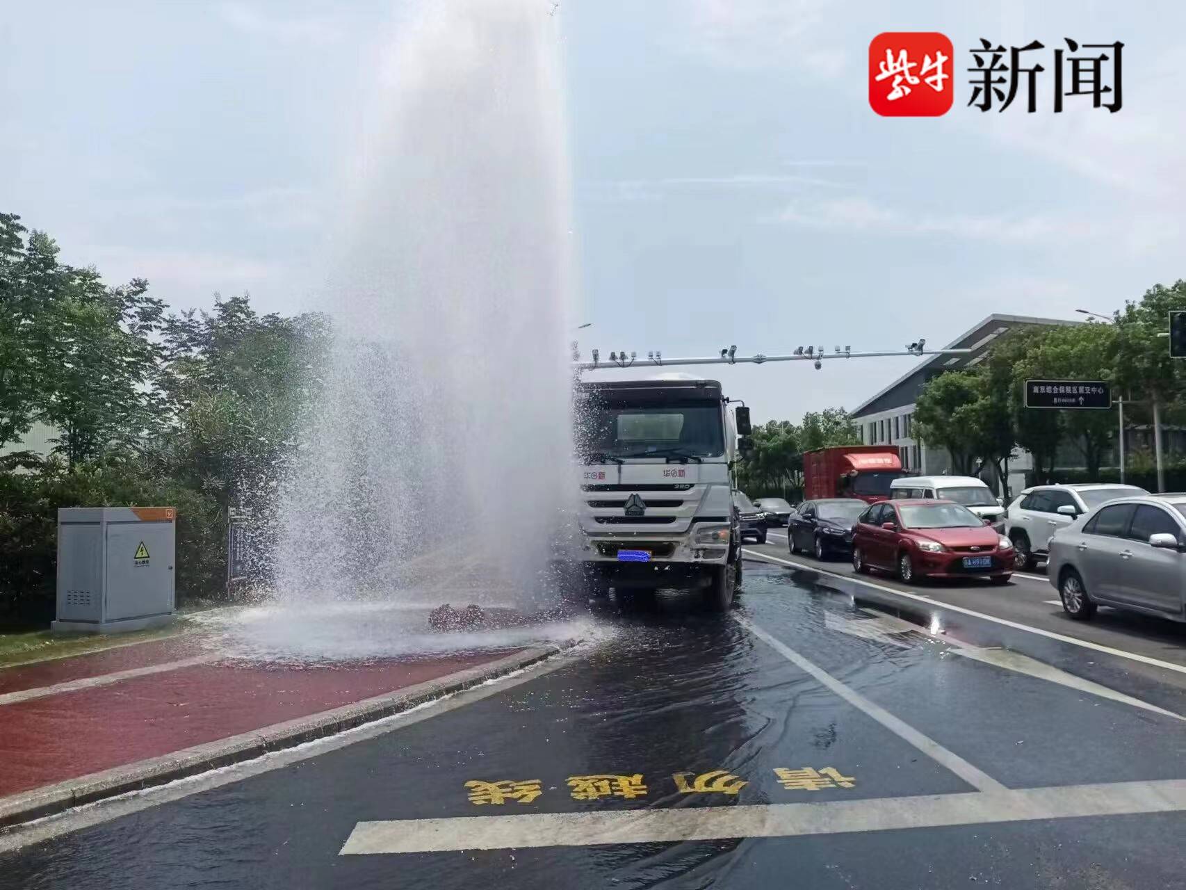 很快,江宁开发区交警中队民警就赶到现场,发现一辆重型特殊结构货车停在路边,路牙上的一个消防栓被连根撞断,水流喷射而出,形成了一根“巨大”的水柱。