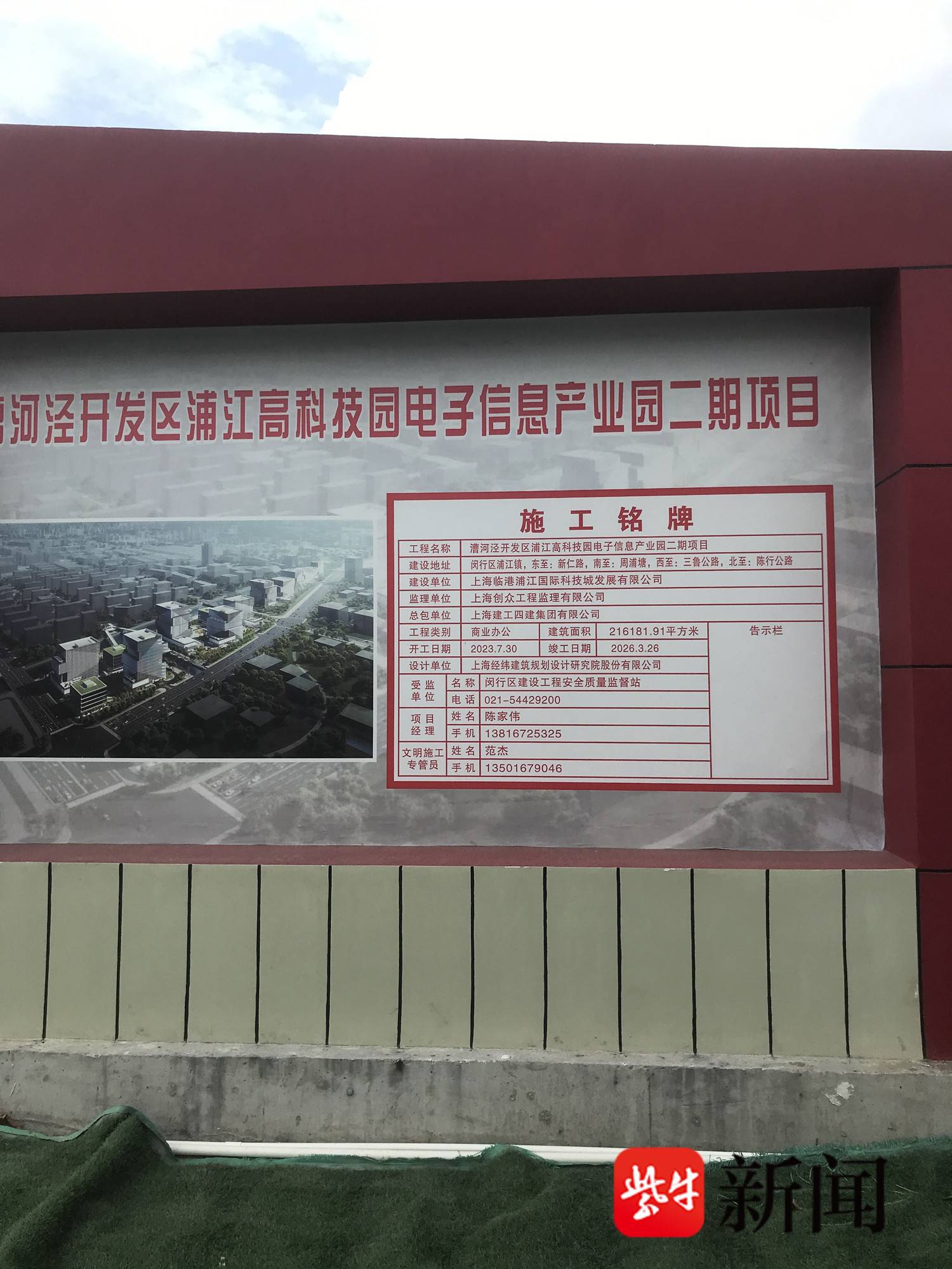 近日,按照报料人的指点,扬子晚报/紫牛新闻记者来到位于上海闵行区浦江镇陈行公路,在该工地的入口处,刷出的相关介绍显示,该工地为漕河泾开发区浦江高科技园电子信息产业园二期项目,今年7月30日开工,工期期限约为32个月,其工程类别为商业办公,建筑面积高达21.6万平方米。