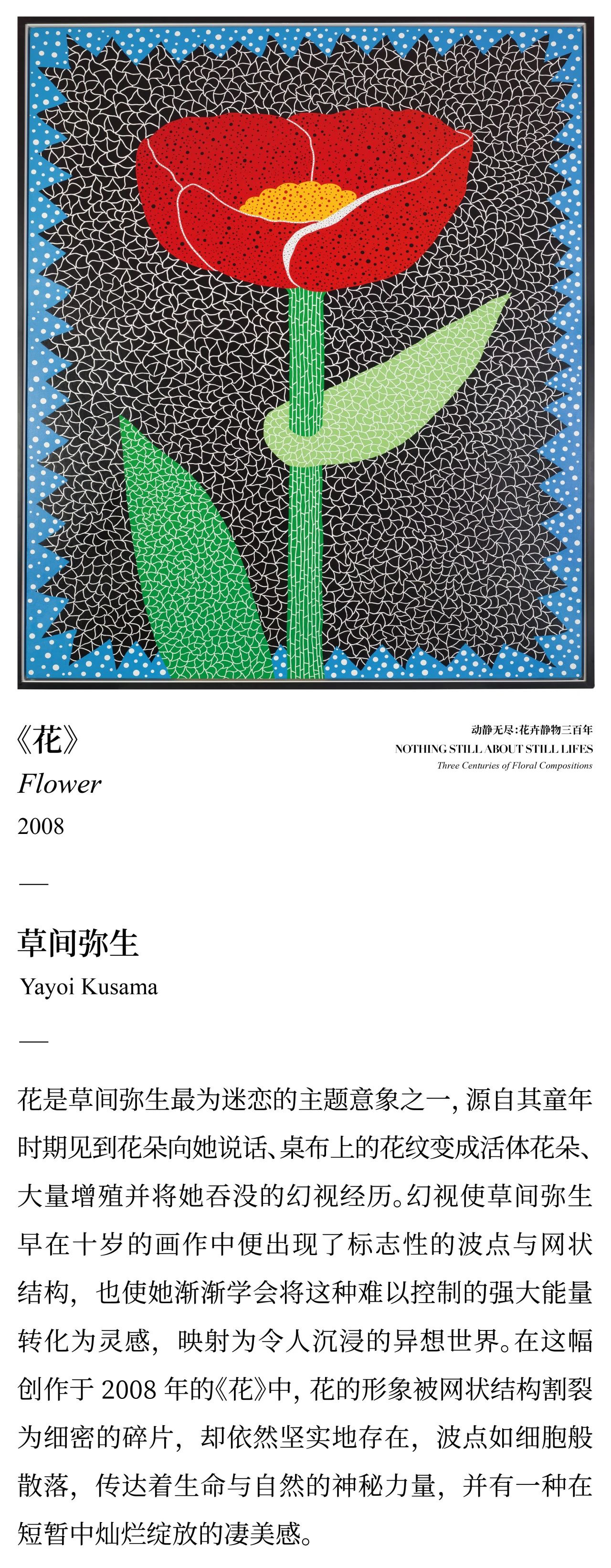 展览的最后一个章节,观众们进入了当代艺术的领域,这是真正具有当下时代特征的艺术,和人们当下的生活有着更加紧密的联系。在杰夫·昆斯、奈良美智、村上隆、安迪·沃霍尔、谢景兰、陈逸飞等艺术家最先锋、最大胆、最具突破性的艺术创新中,从来不乏花朵的身影。在第四章节“突围绽放”洁白无瑕的展墙之下,一切探索与革新,静物画中全新的突破和无限的可能性,都将在此展开。