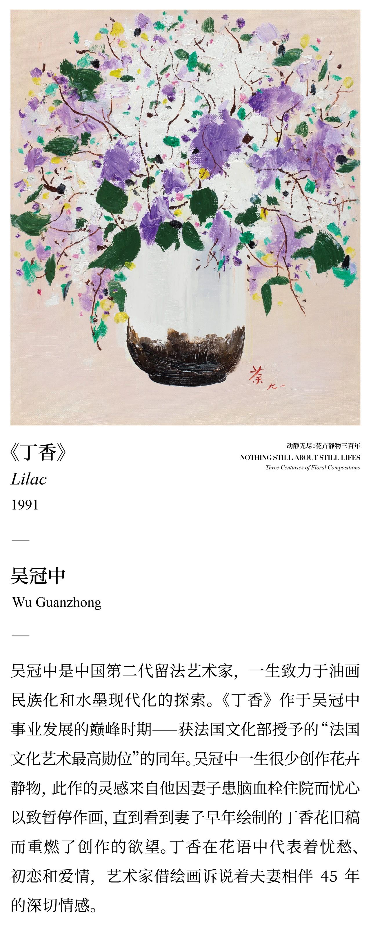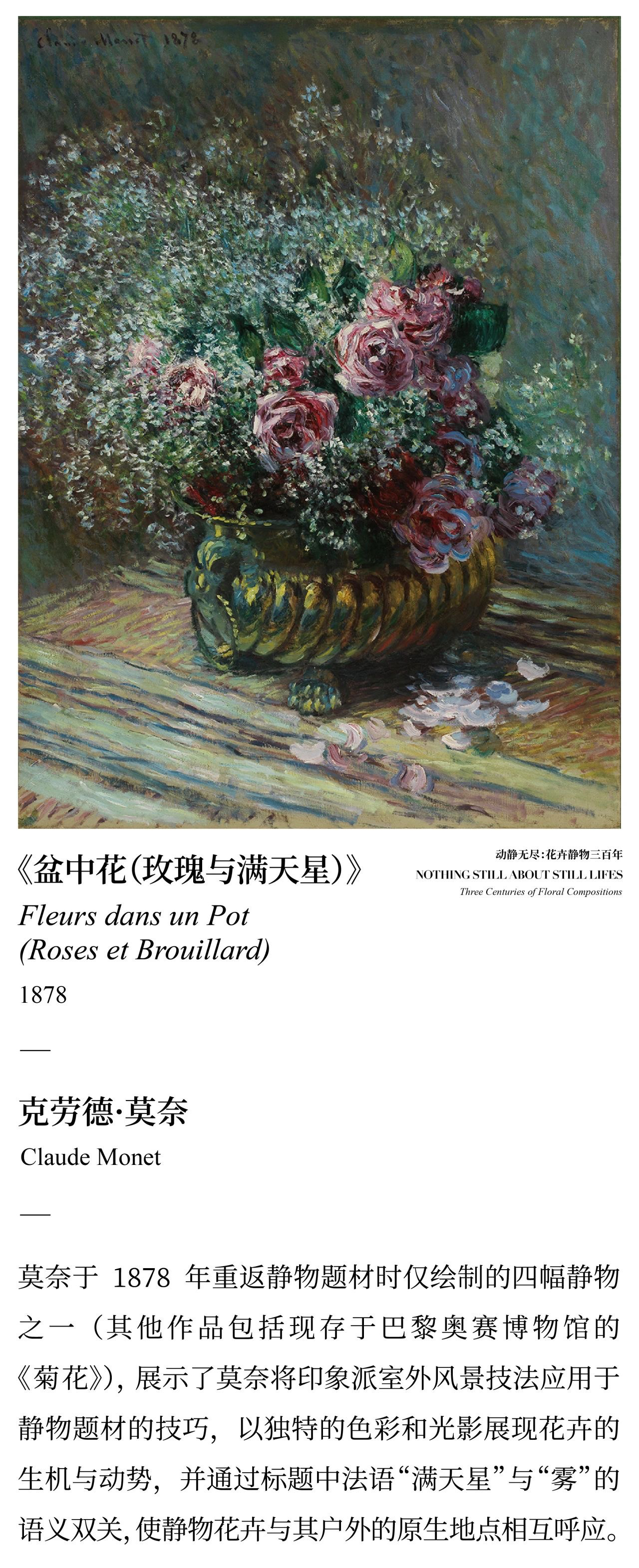 在这百余件殿堂级艺术作品中,不乏莫奈于 1878 年重返静物题材时仅绘制的四幅静物之一的《盆中花(玫瑰和满天星)》;毕加索艺术发展关键时刻的一幅罕见的早期静物画——《瓶花》;中国第一代留法艺术家,中国现代绘画的奠基人之一,“中国抽象艺术之父”,吴大羽创作风格向抽象转变时期的重要作品——《瓶花》等等对于艺术家而言非常重磅的作品。