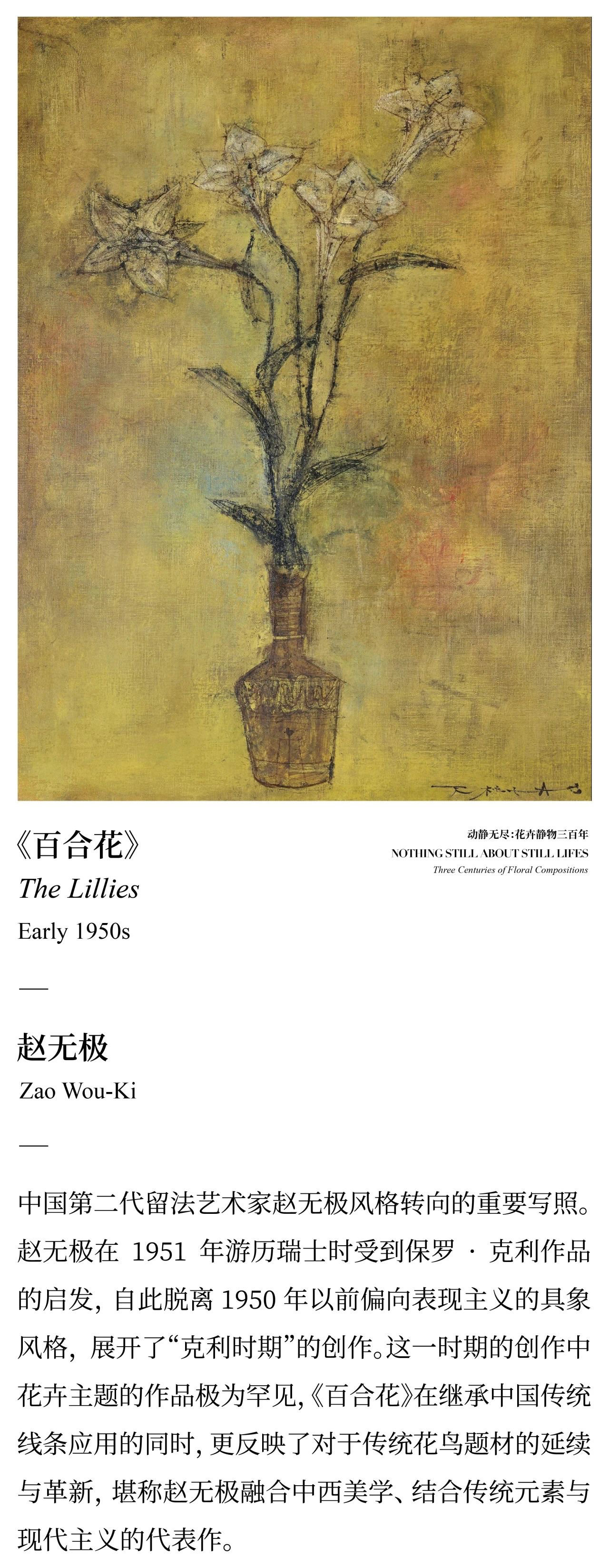 在展出作品体量与品质上,德基艺术博物馆此次也显示出其非凡的抱负与追求。近百位参展艺术家中涵括莫奈、毕沙罗、塞尚、高更、毕加索、蒙德里安、莫兰迪、马格里特、乔治娅·欧姬芙等西方现代艺术各流派的里程碑式人物;常玉、潘玉良、吴大羽、吴冠中、赵无极、朱德群等中国第一、二代留洋艺术先驱,黎谱等亚洲其他国家的现代艺术开拓者;以及安迪·沃霍尔、草间弥生、大卫·霍克尼、杰夫·昆斯、奈良美智、村上隆、达明安·赫斯特等全球顶尖当代艺术家的百余件珍罕佳作。在全球范围内也极少见到数量如此众多、品质如此卓越、创作者如此杰出、文化背景如此多元的花卉静物作品在同一展览中呈现。