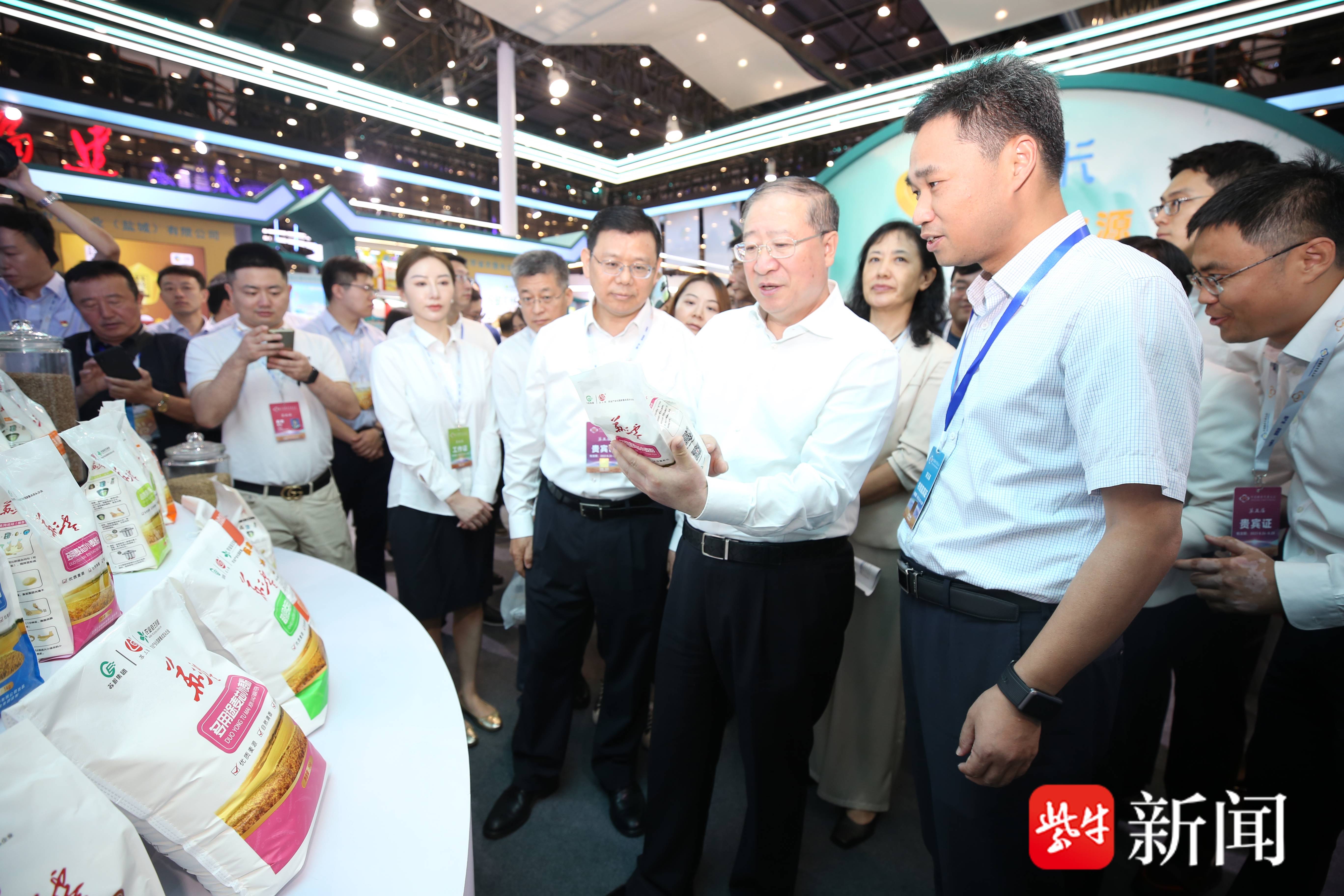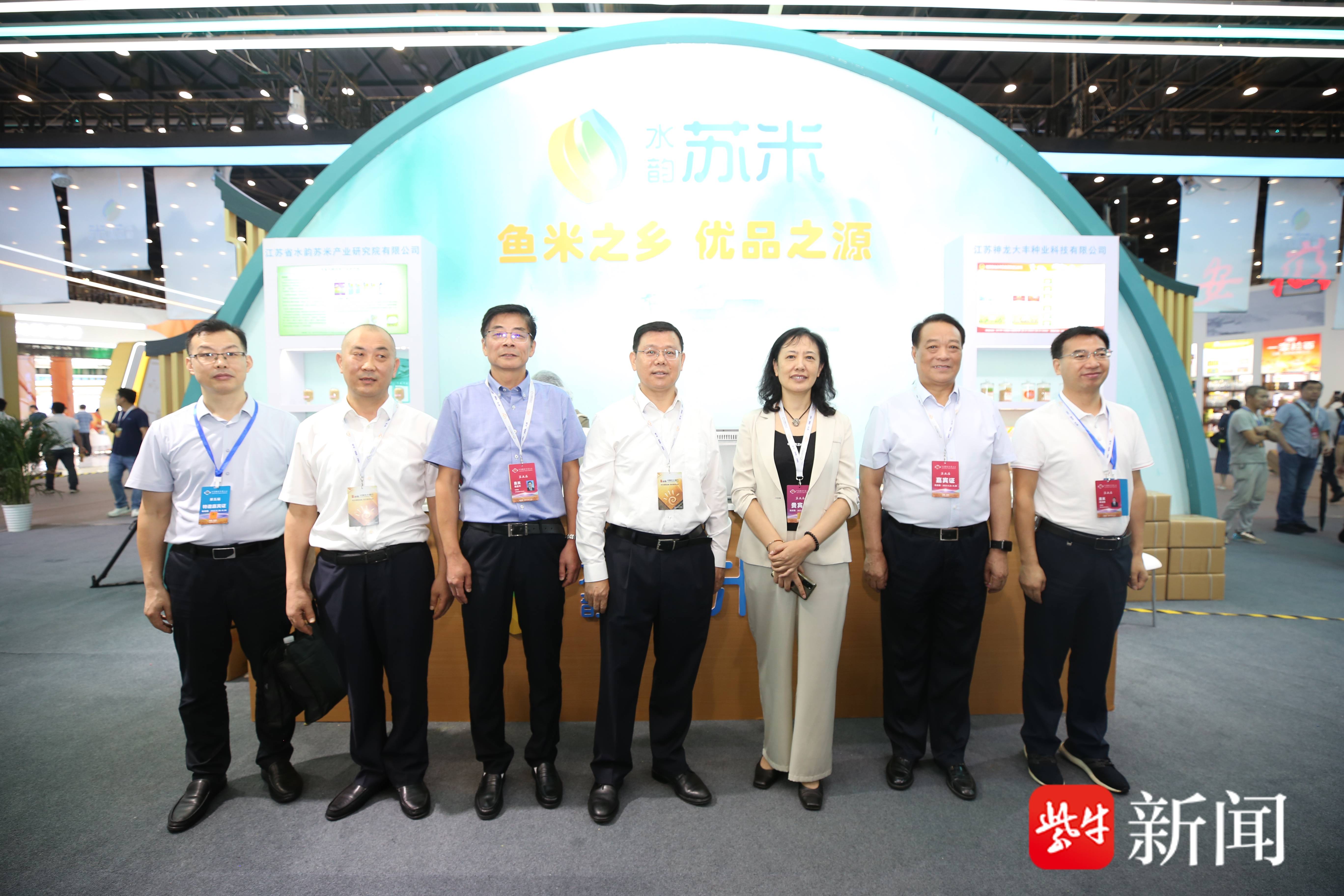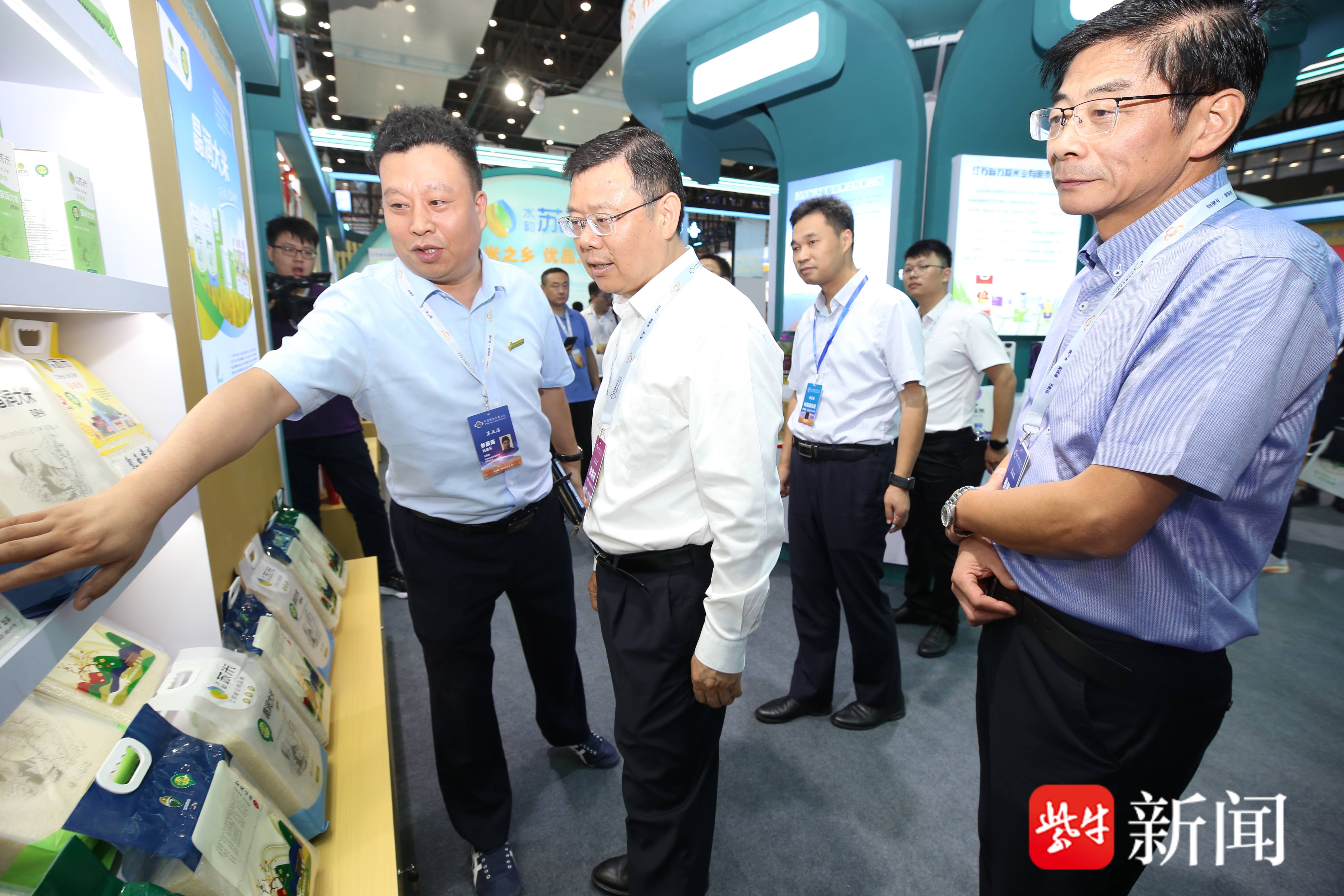 粮交会开幕式结束后,国家粮食和物资储备局党组书记刘焕鑫一行来到江苏展区参观。江苏省粮食和物资储备局党组书记、局长胡建军介绍,“水韵苏米”省域公用品牌建设与市县域、企业品牌形成联动,实现粮农增收和粮企增效。刘焕鑫称赞江苏农业的现代化水平很高,充分肯定了“水韵苏米”品牌建设对推动粮食产业高质量发展走在前列的作用和成绩。