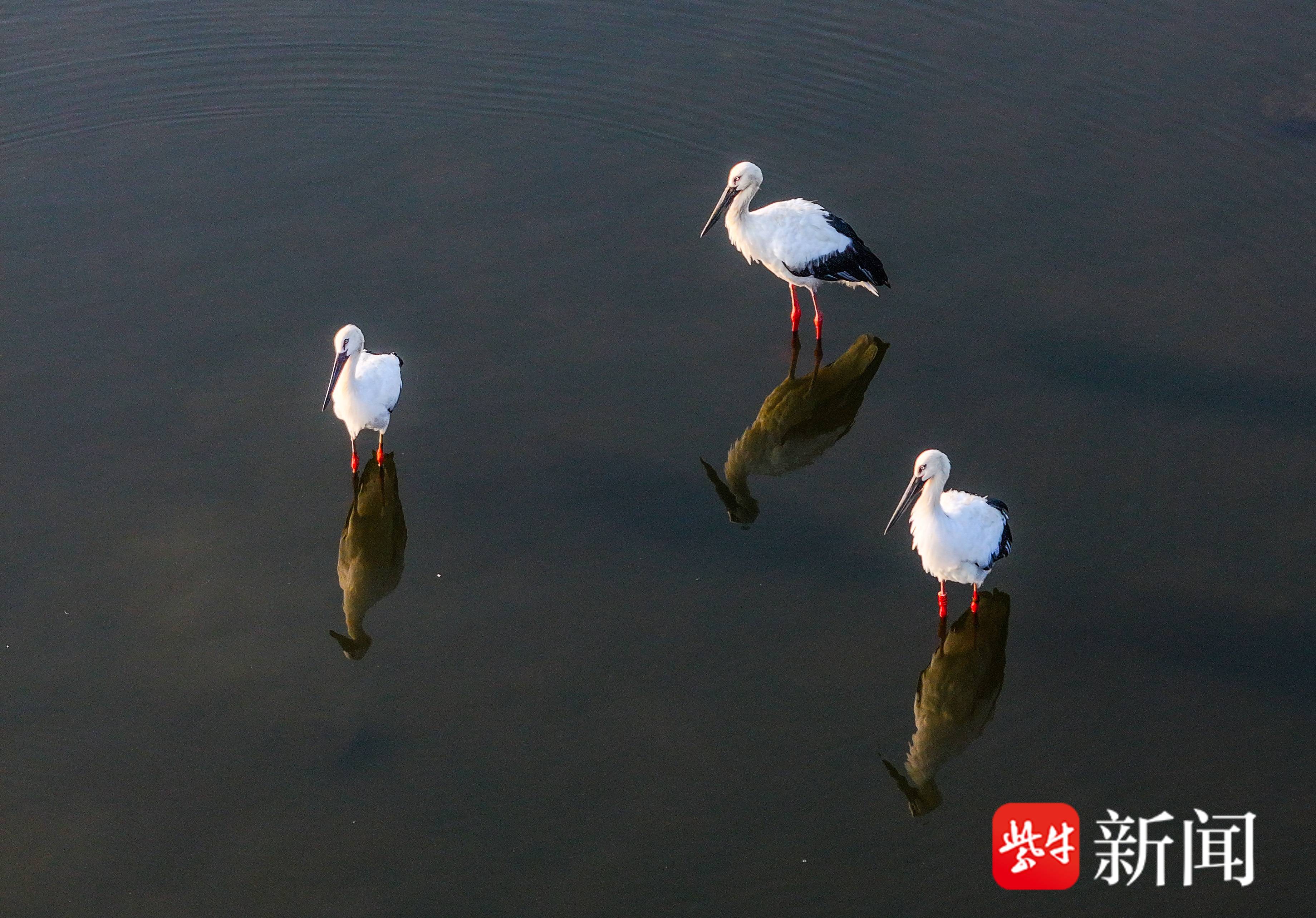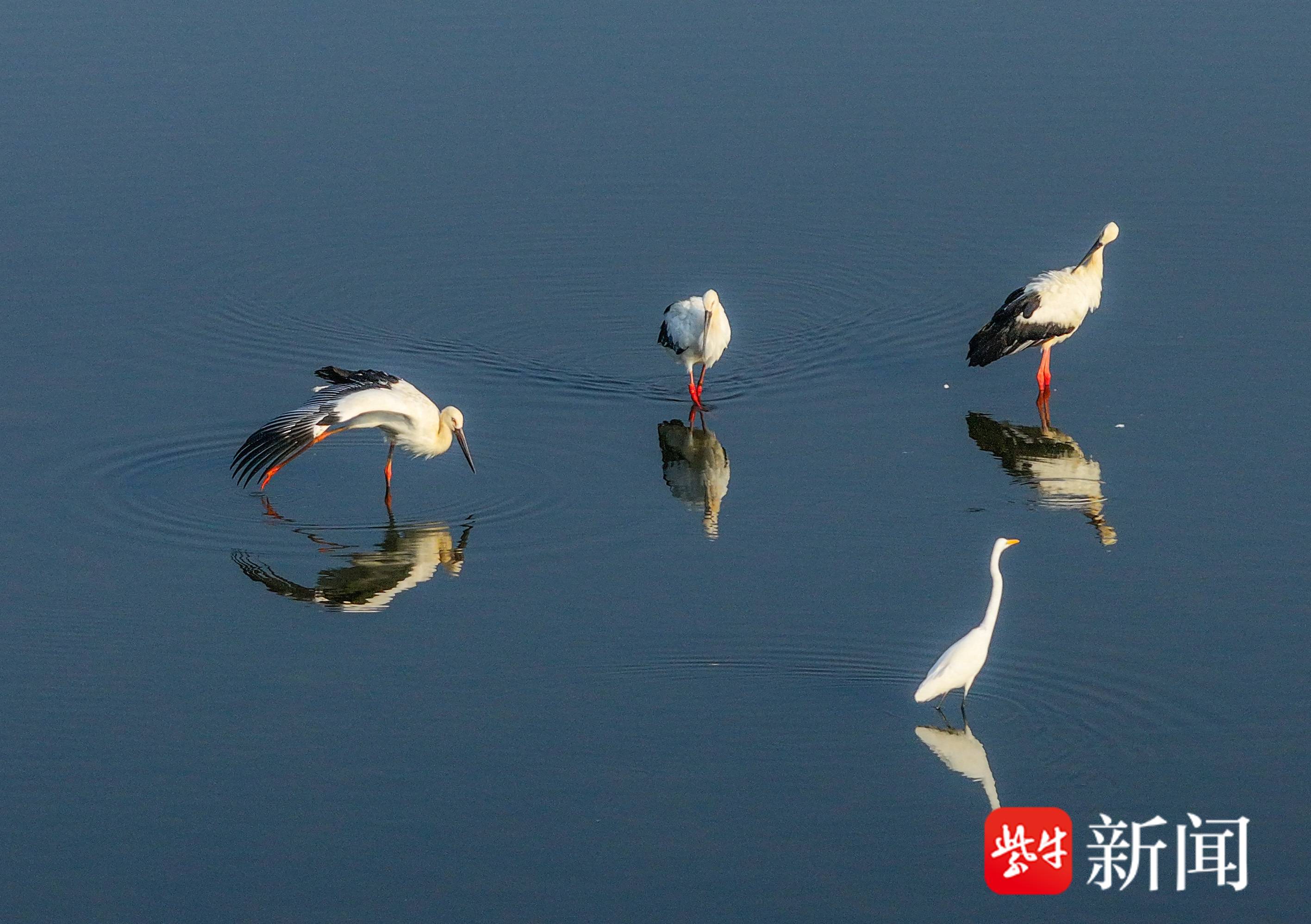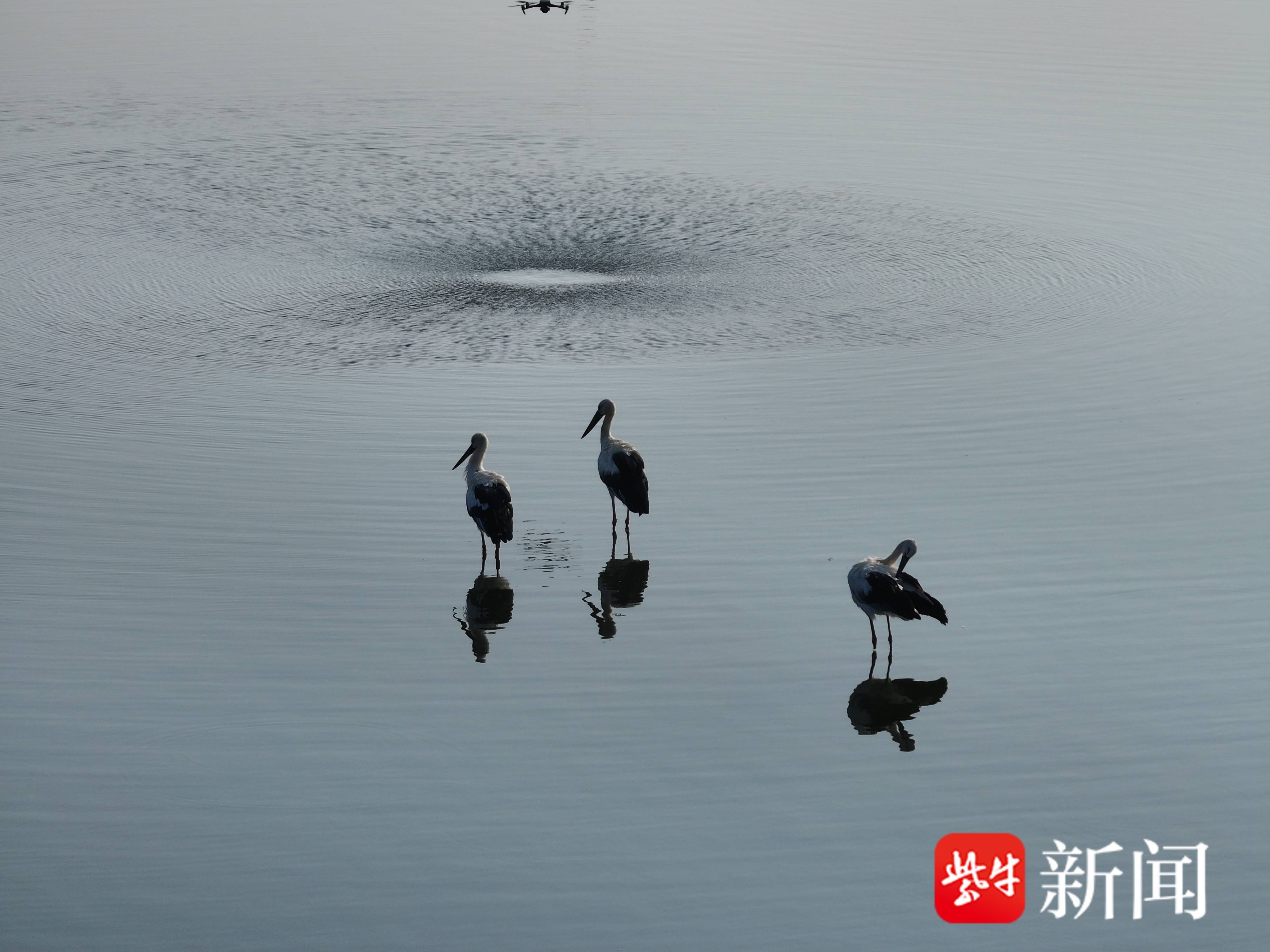 9月2日,3只国家一级保护鸟类东方白鹳飞抵在江苏省盱眙县的水面上,这是当地水域首次观察到东方白鹳落脚。它们有的在水中悠然散步,有的在岸边梳理羽毛,有的在水面上戏水觅食,有的在空中自由漫舞。