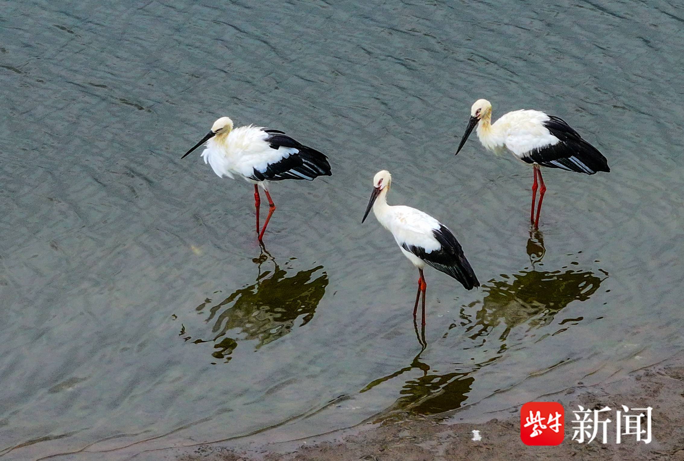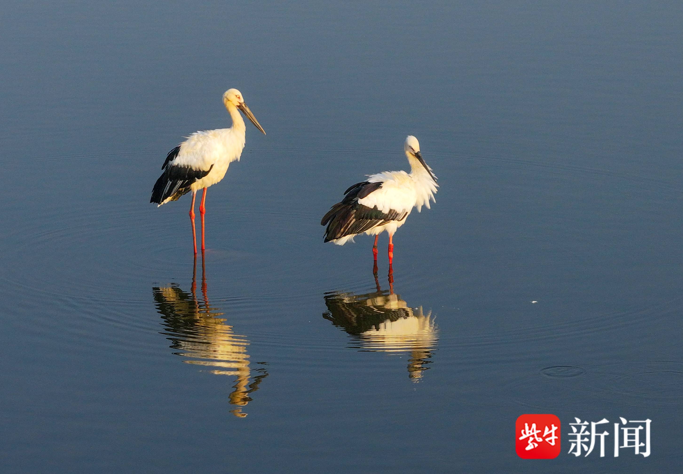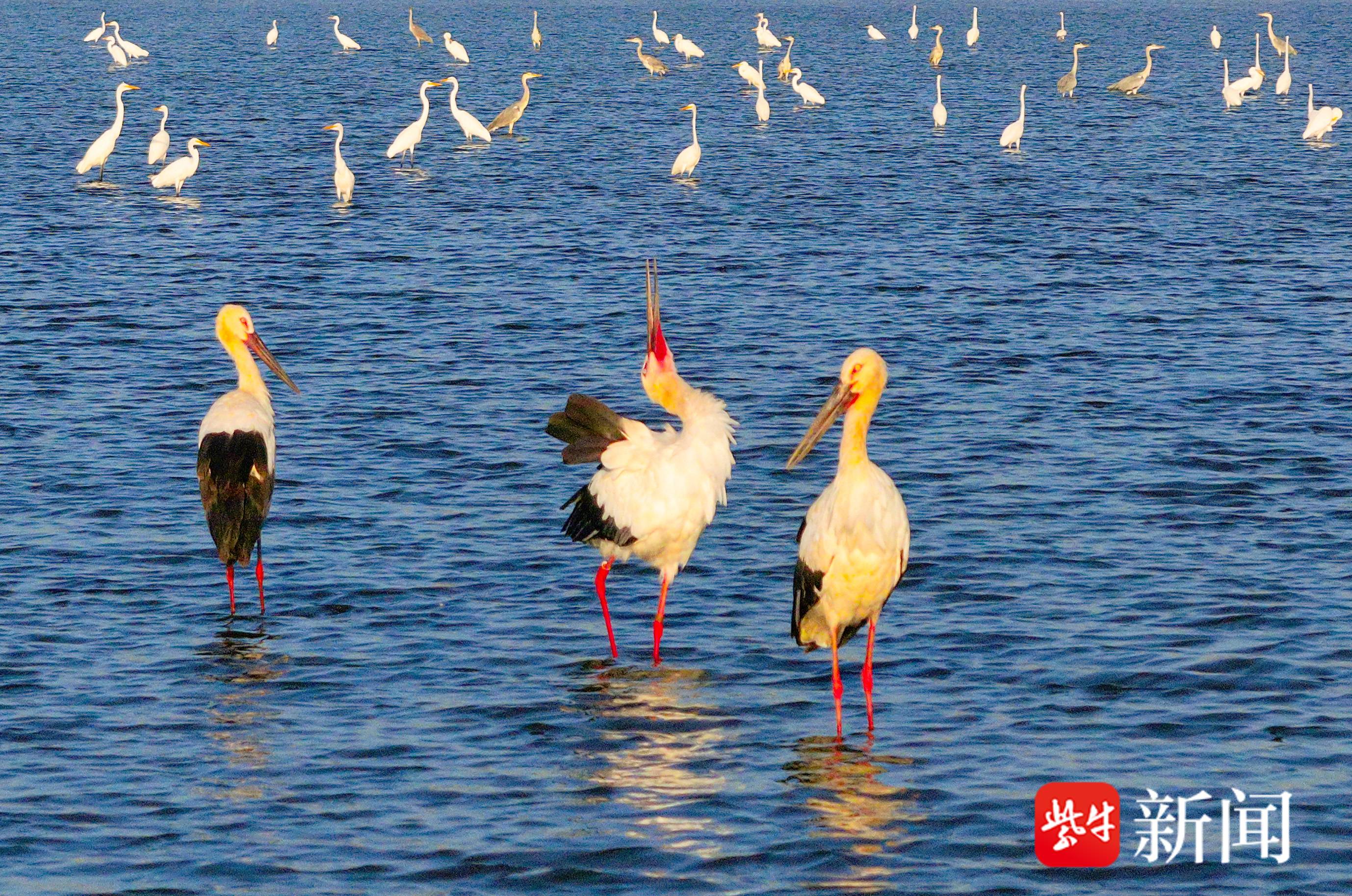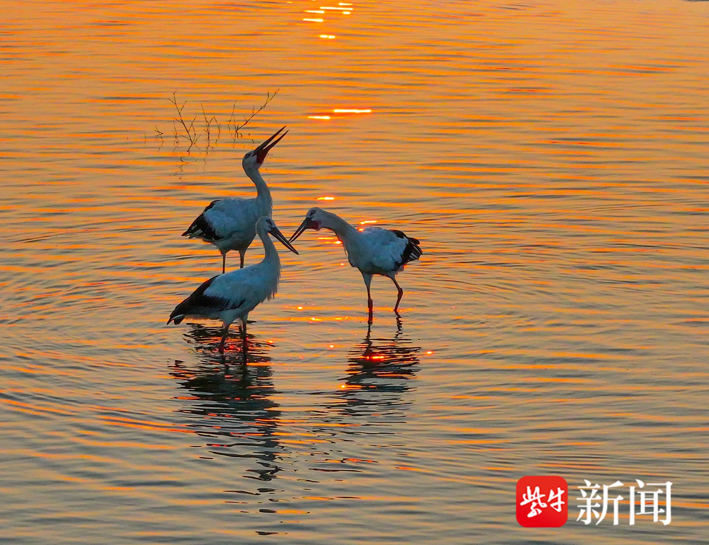 9月2日,3只国家一级保护鸟类东方白鹳飞抵在江苏省盱眙县的水面上,这是当地水域首次观察到东方白鹳落脚。它们有的在水中悠然散步,有的在岸边梳理羽毛,有的在水面上戏水觅食,有的在空中自由漫舞。
