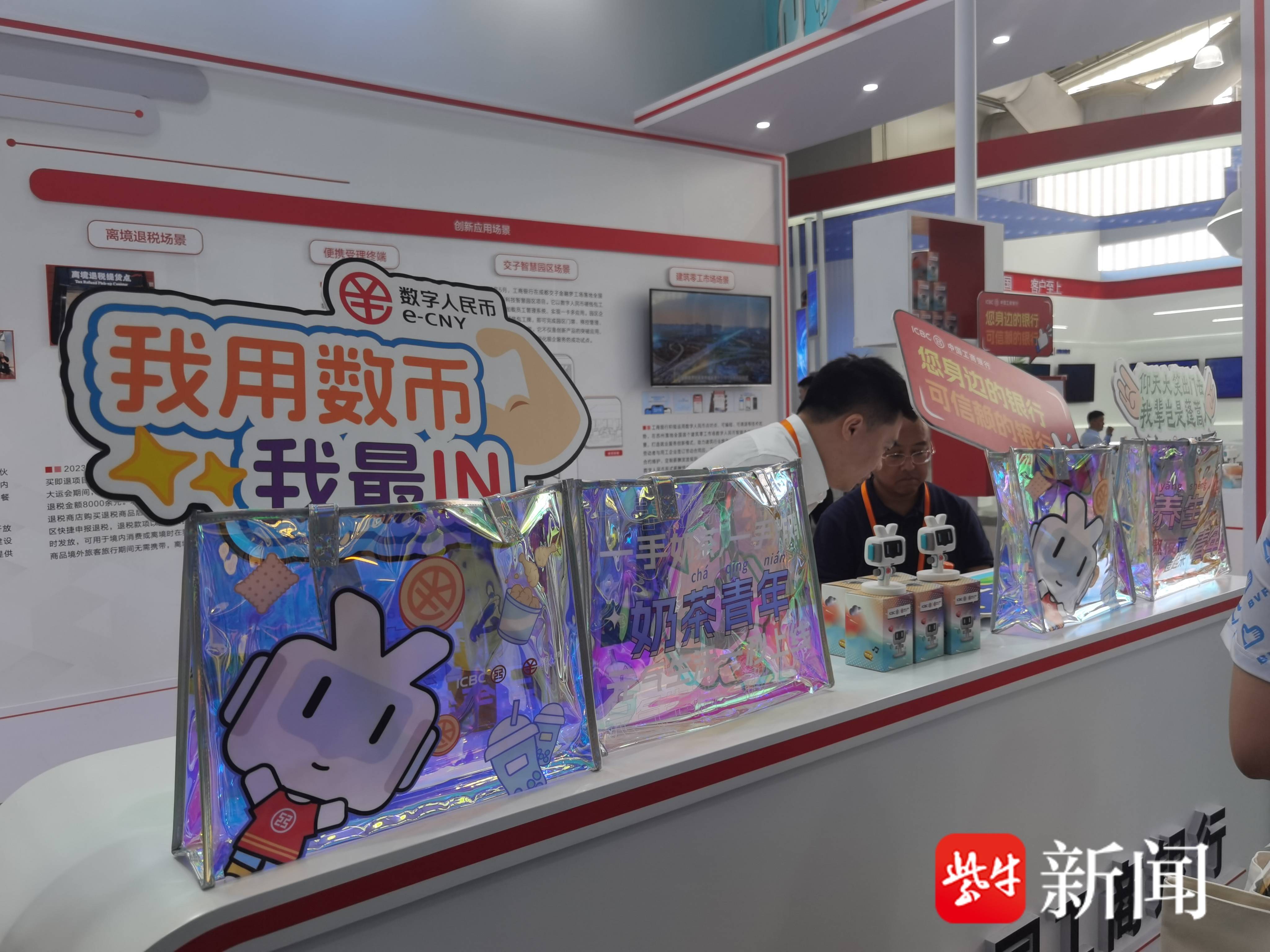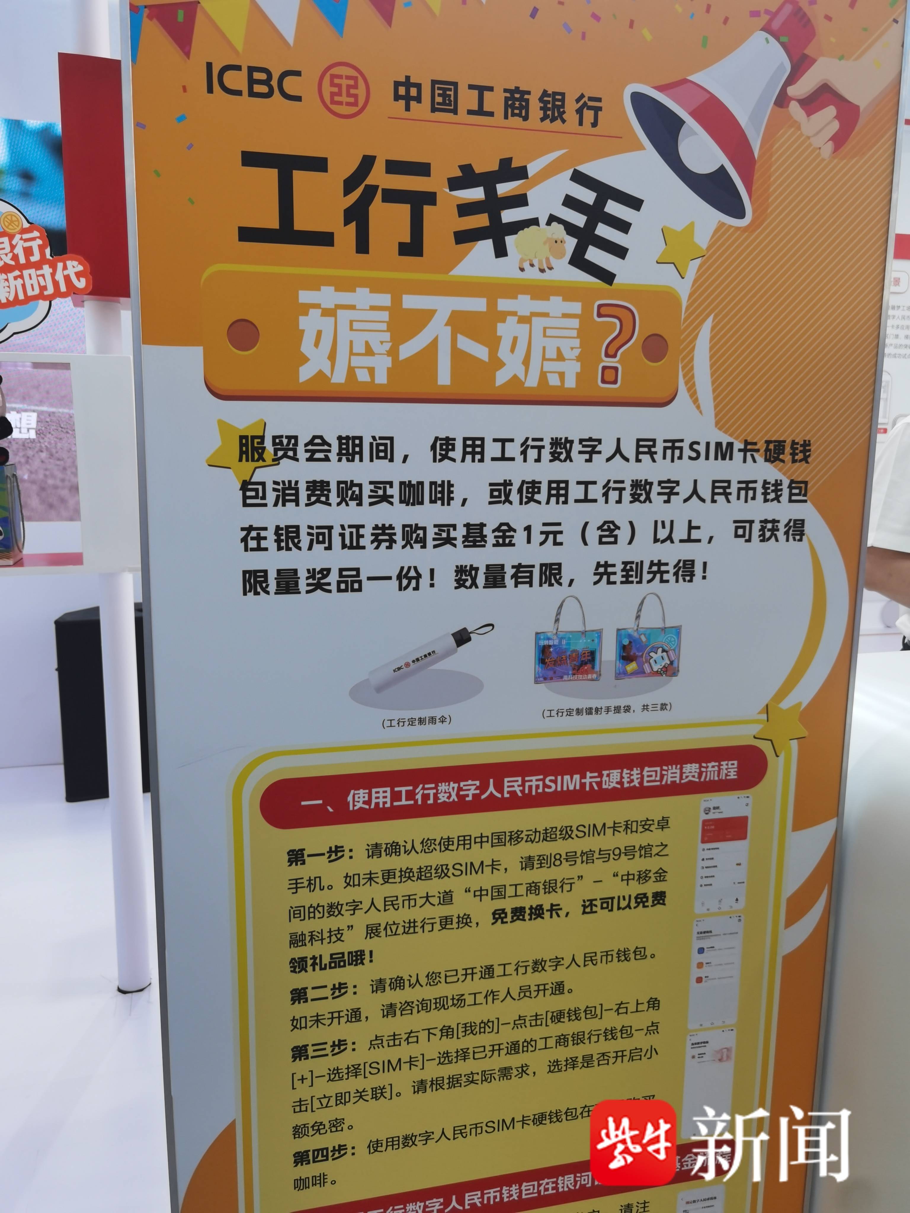 “工行羊毛薅不薅?”工商银行展台的宣传语很“直白”,使用工行数字人民币购买咖啡,可以获得雨伞或镭射手提袋。工商银行工作人员告诉记者,镭射手提袋最受欢迎,方便大家装服贸会上薅来的各种“羊毛”。