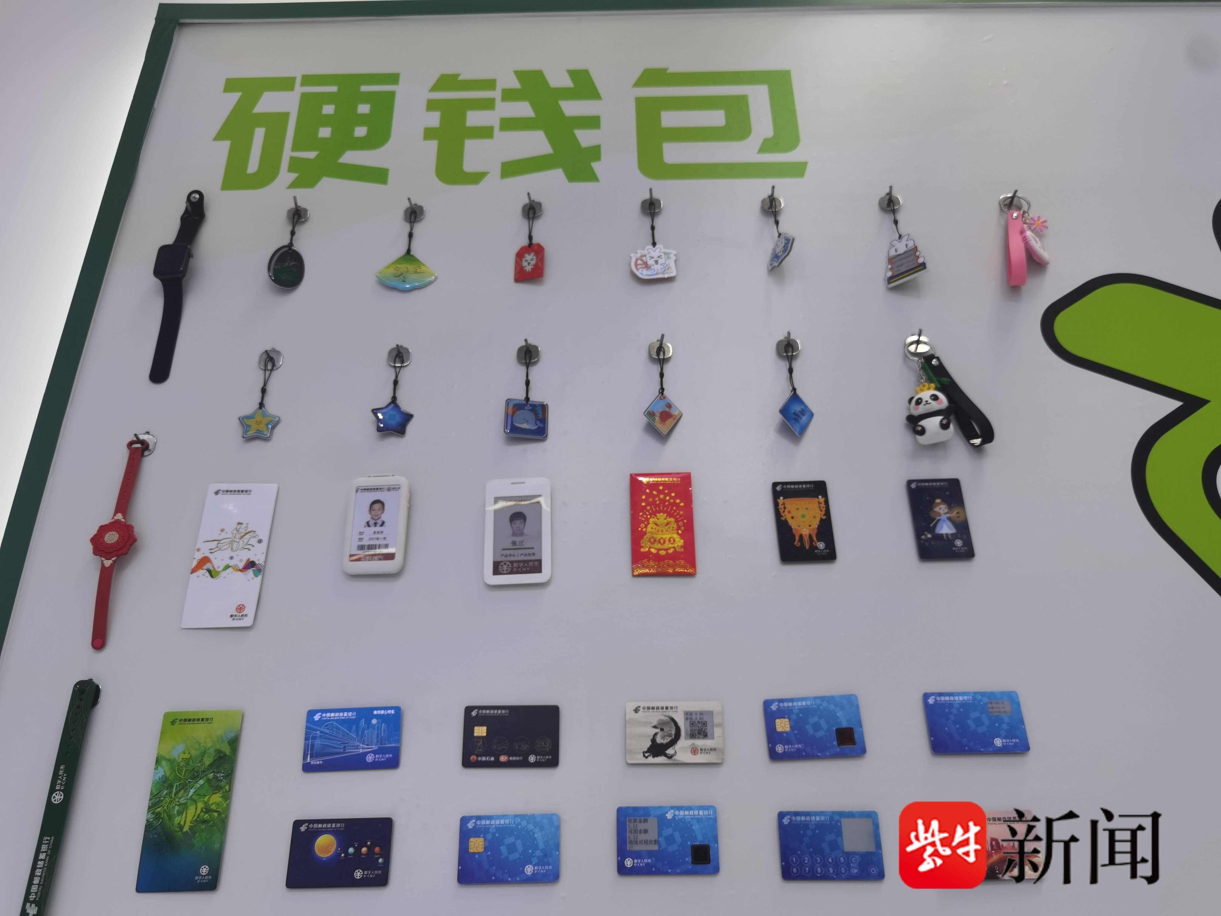 邮储银行展示了一面墙的数字人民币硬钱包,从智能手表到钥匙扣、员工卡等都有。工作人员表示:“目前只发售了2款硬钱包,都是实体卡。其余‘概念款’以后会逐步推出。”其中有一种类似孩子的校园卡,家长可以圈存一笔钱到卡里给孩子发零花钱,由于支持离线,孩子可以随身带到学校。这种硬钱包也同样适合没有或者不擅长使用智能手机的老年人。