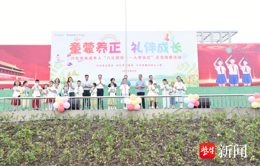 兴化市委宣传部副部长、市文明办主任邵如柏,市教育局副局长戴金萍,兴化高新区管委会副主任、戴南镇宣传委员刘惺,戴南镇关工委副主任李根山等,向孩子们赠送了“养正少年”成长卡。在老师的指导下,全体新生举行了开笔仪式,他们学写的第一个字是“人”。