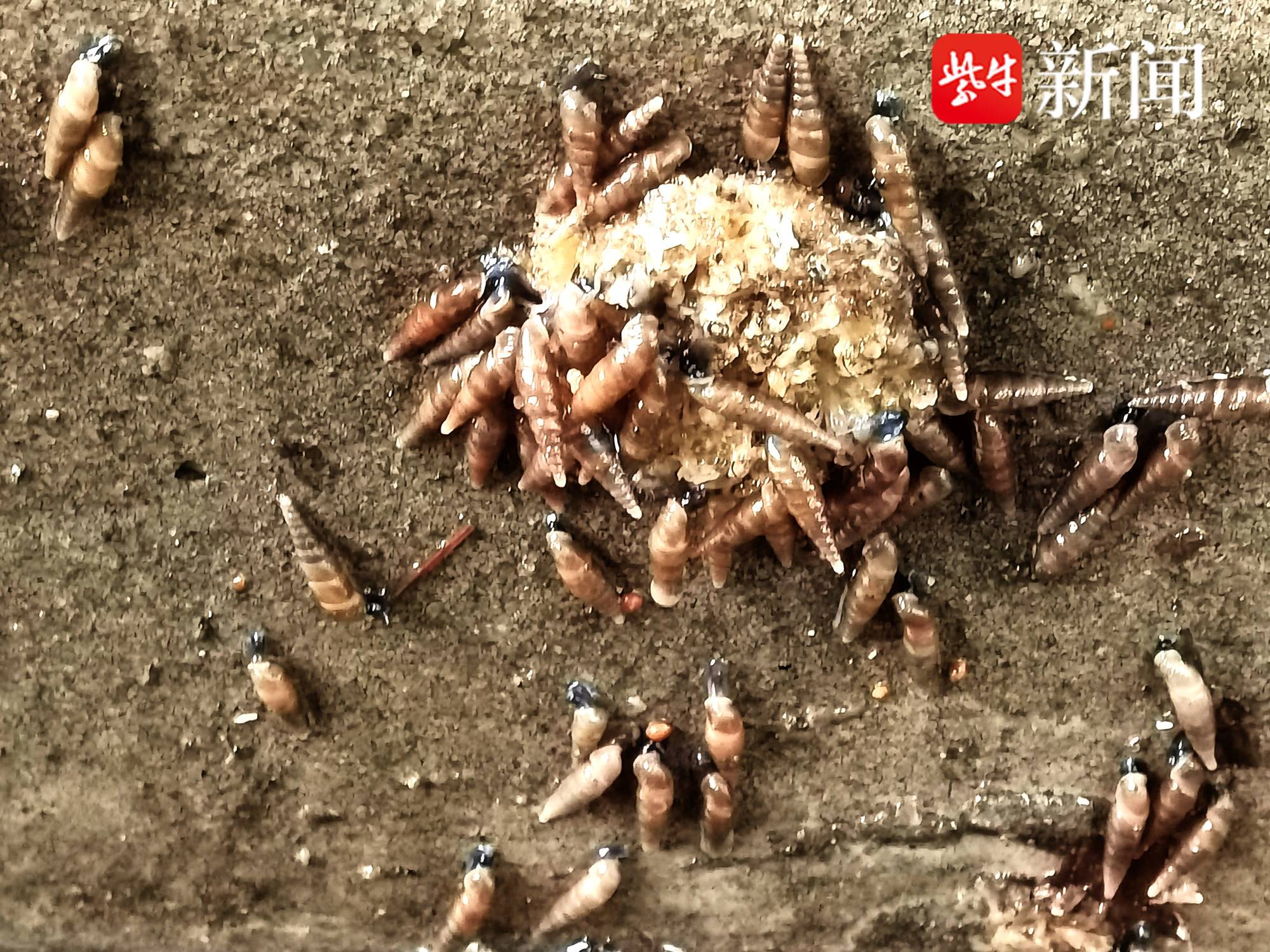 据介绍,当时,在金川河岸边,出现了数量较多的螺蛳,一部分已被环卫工人清扫掉。不过,仍有一些螺蛳散落在花坛和道路一侧上。这些螺蛳约2厘米长,整体呈尖锥形,一端闭合,一端开口,壳内有软体和黑触须,还能在地上慢悠悠地爬行。