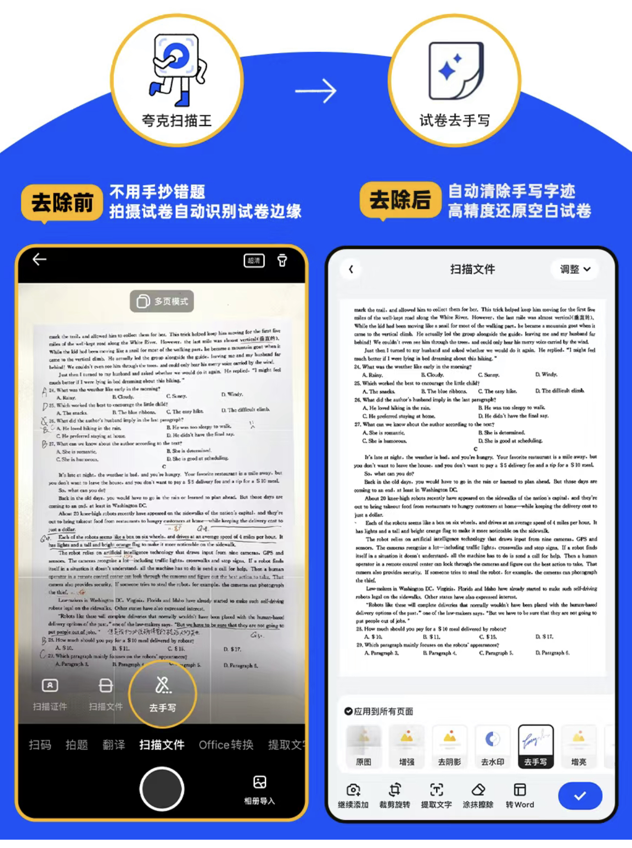 此外,去除手写字迹也是老师们在扫描中的刚需之一,无论是试卷里的手写答案还是纸质资料上的笔记,夸克扫描王App通过深度学习图像技术,可以一键擦除无用元素,在这个过程中,系统可以根据被擦除区域周边的图像特征和颜色进行深度还原,更好地突出和保留重要内容。