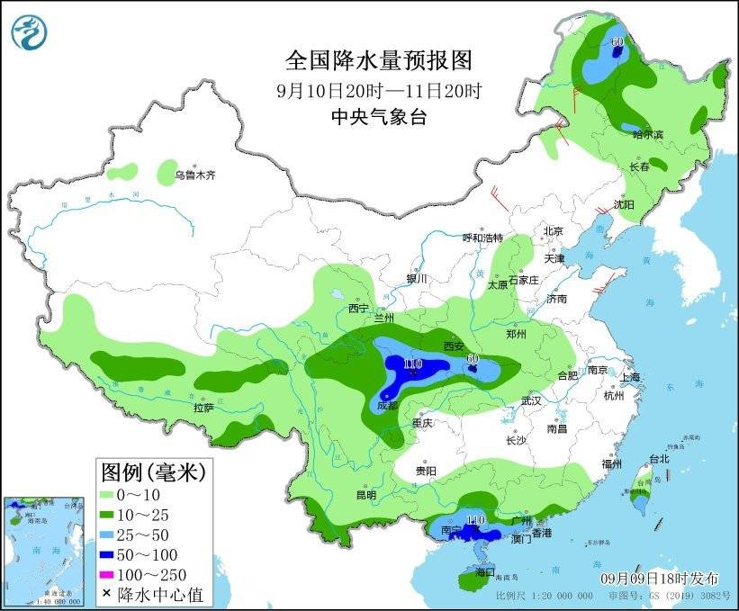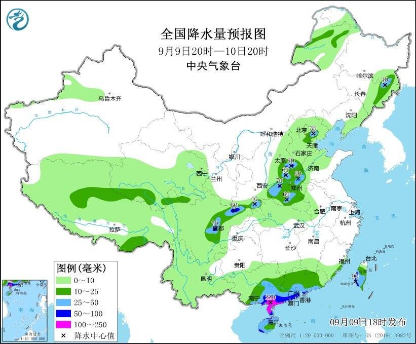 9月9日20时至10日20时,河北南部和东部、山西南部、河南大部、北京东南部、天津北部和西部、四川盆地西部和北部、吉林东部以及广东大部、广西中南部、海南岛、台湾岛等地部分地区有中到大雨,其中,四川盆地西南部和东北部、广西东南部沿海、广东西南部、台湾岛西南部等地局地有暴雨或大暴雨(100~220毫米)(见图2)。