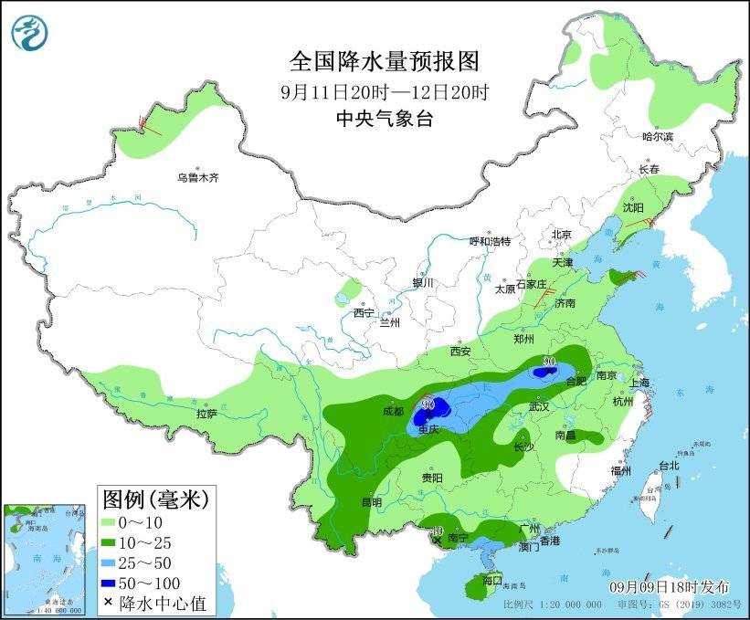 9月11日20时至12日20时,江淮大部、江汉、江南西部、西南地区东部和南部、华南南部和海南岛等地部分地区有中到大雨,其中,河南南部、四川盆地东部、重庆中西部等地局地有暴雨(50~90毫米)。辽宁东部、新疆北疆北部、山东北部和东部、浙江北部等地部分地区有4~6级风(见图4)。