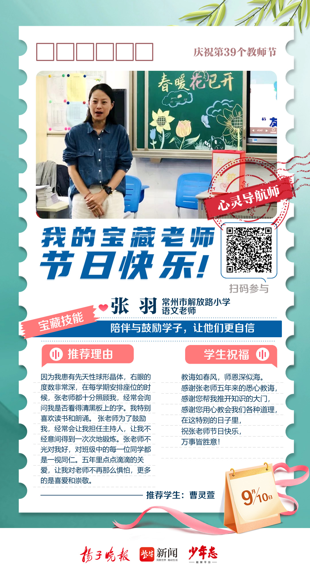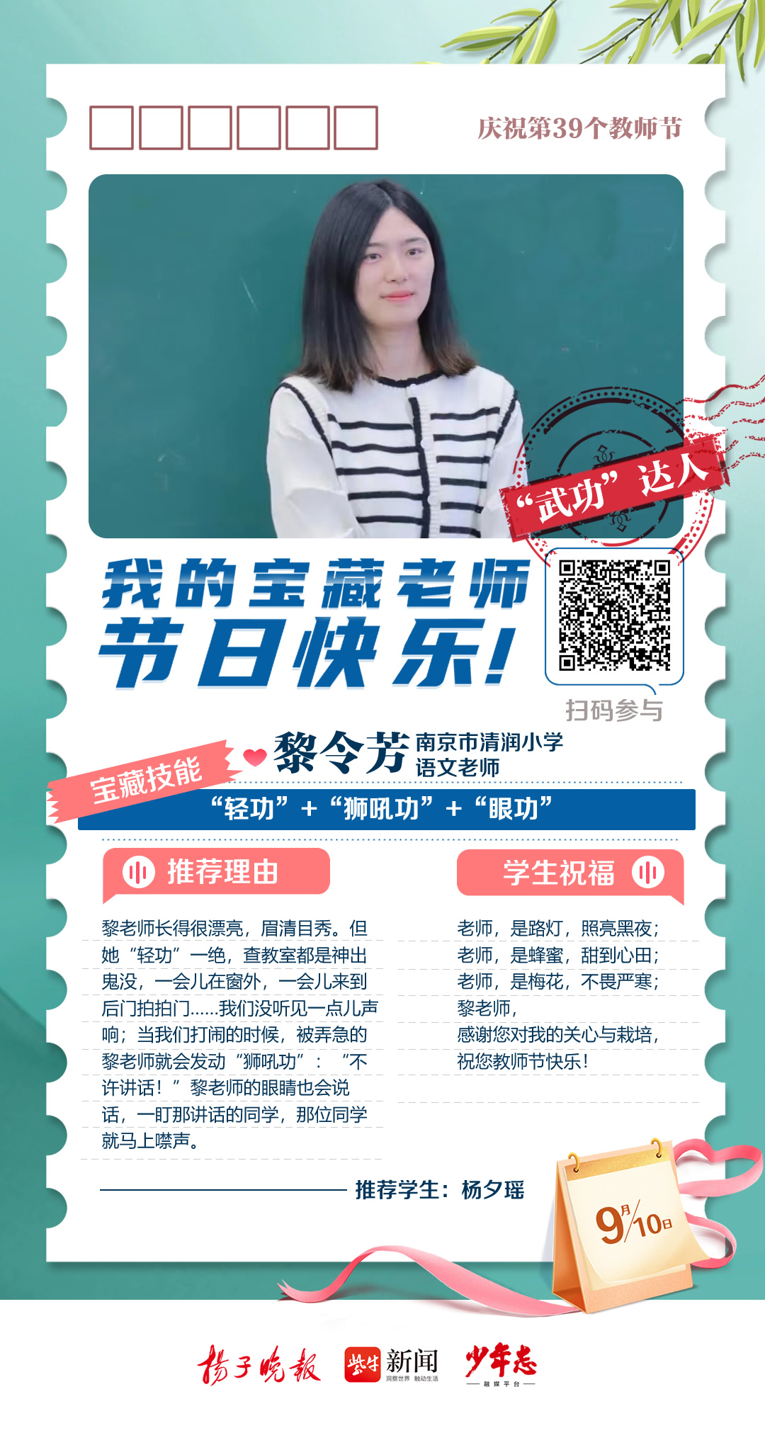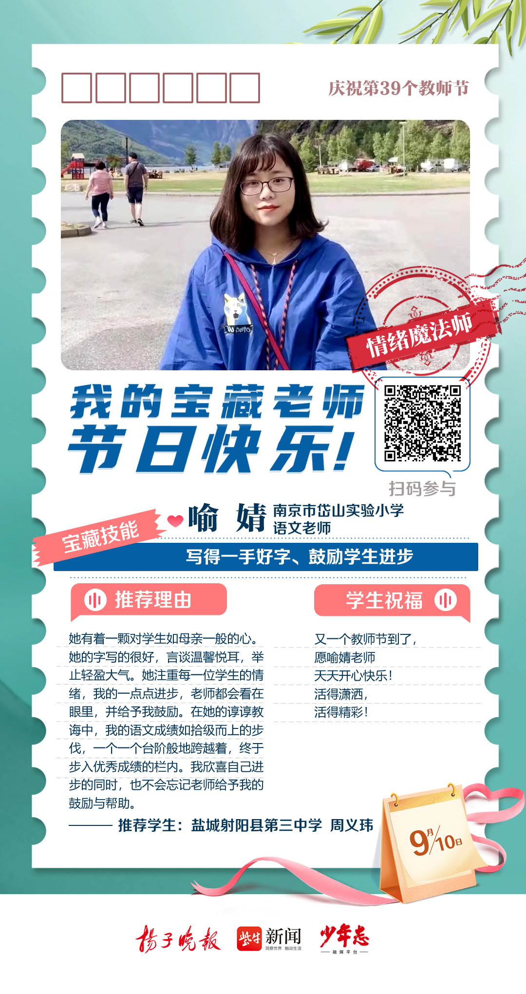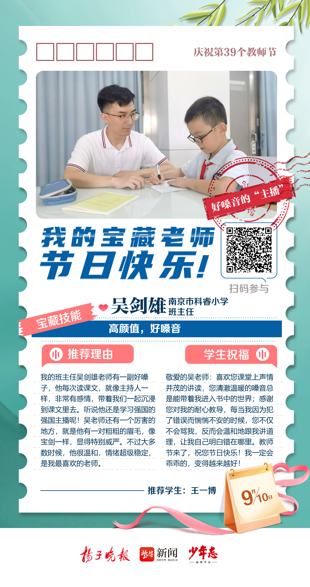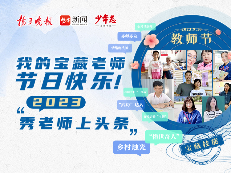 第39个教师节来啦!今天,扬子晚报少年志融媒平台从2023“秀老师上头条”活动众多来稿中精选出9篇动人的学生告白,奉上一组精心制作的教师节“九宫格”海报,为广大教师群体送上最诚挚的祝福。此外,今年的“秀老师上头条”活动仍在火热征集中,快来晒出你的宝藏老师,分享TA的“宝藏技能”,点赞数位列前三名的老师将获得扬子晚报、少年志融媒平台头条报道哦!