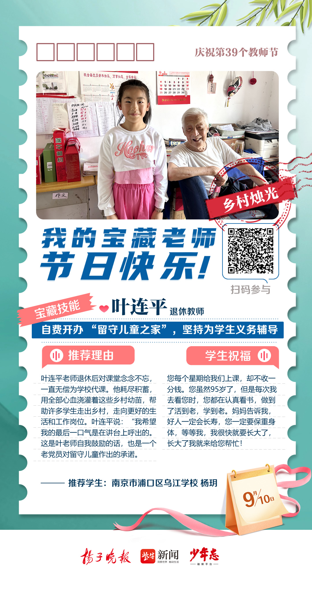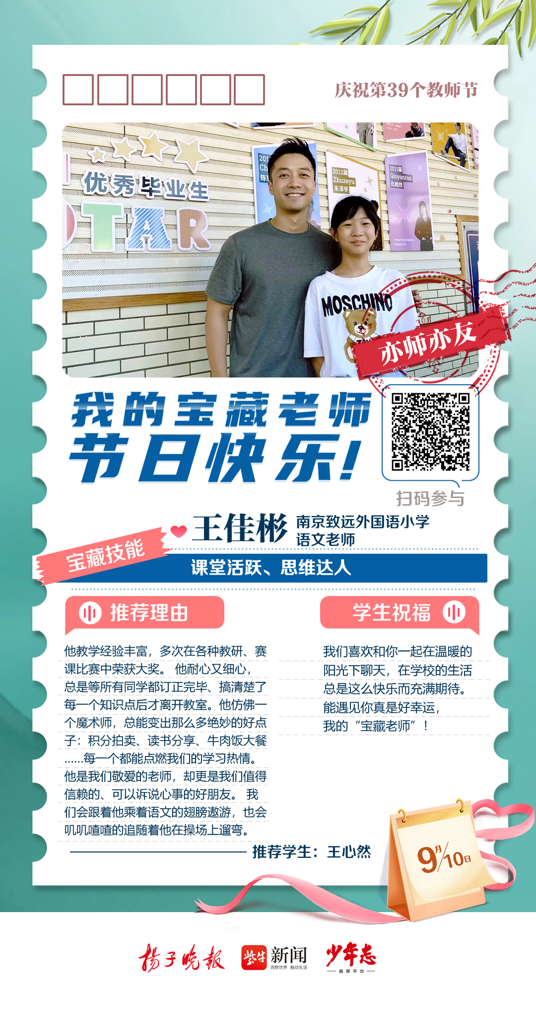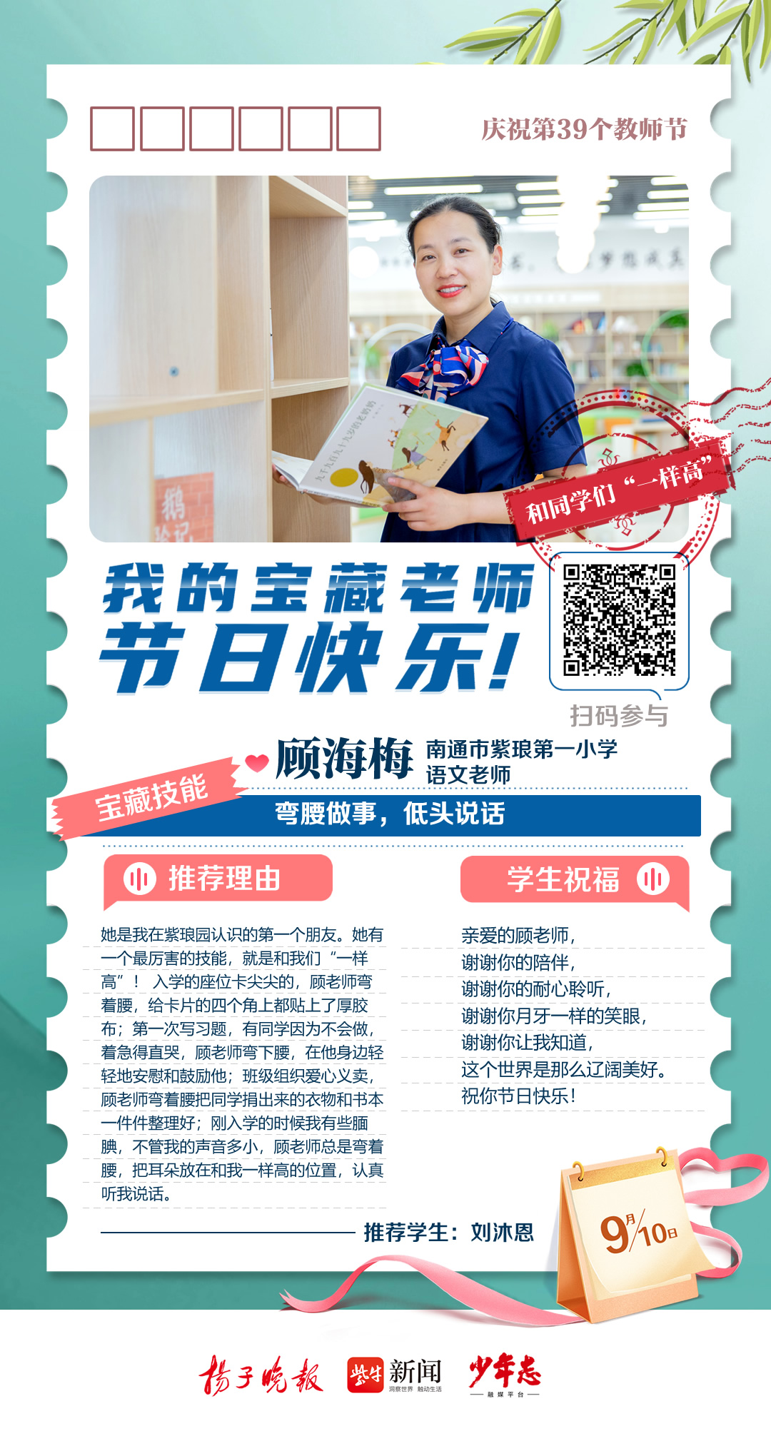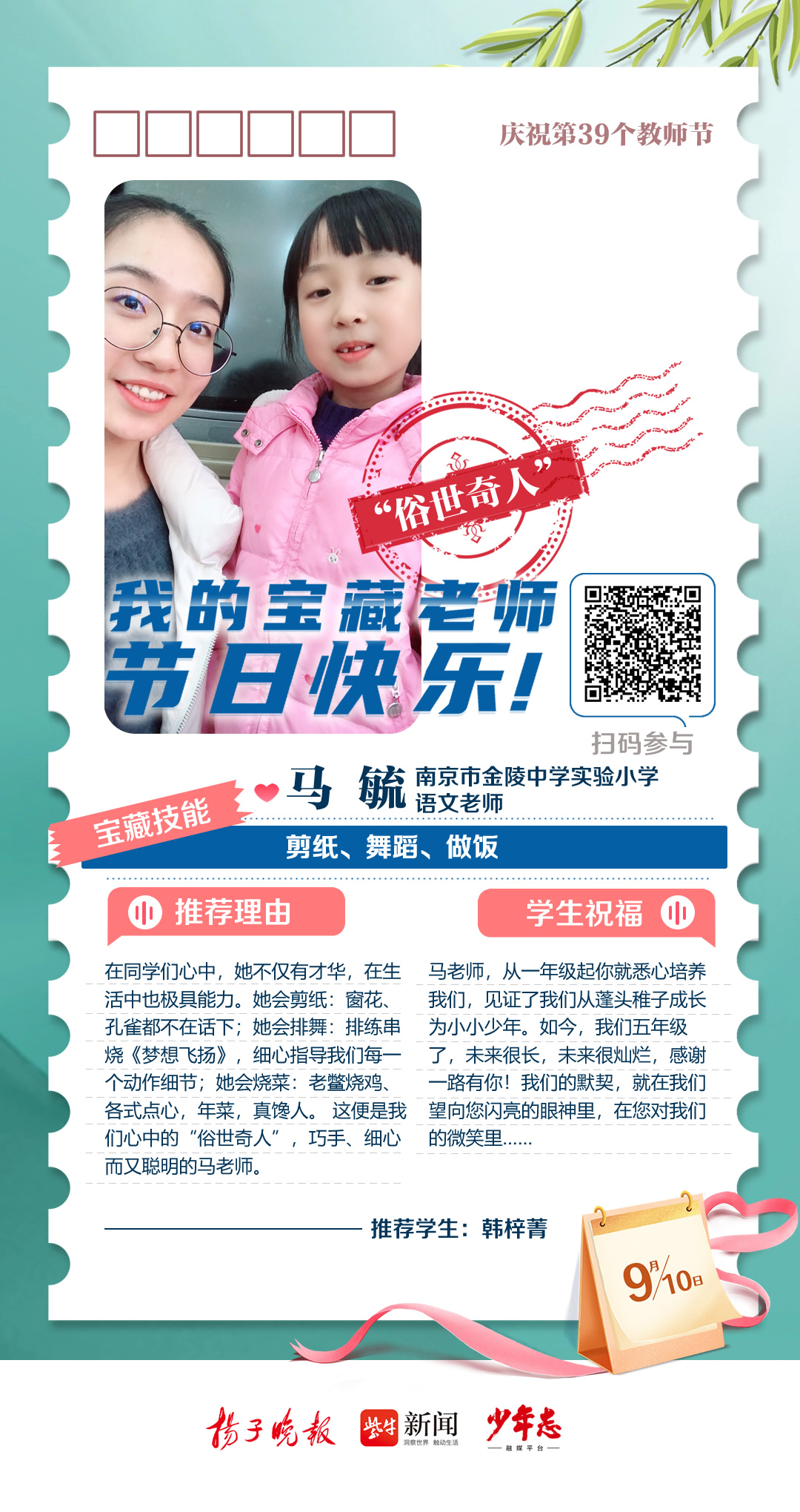 第39个教师节来啦!今天,扬子晚报少年志融媒平台从2023“秀老师上头条”活动众多来稿中精选出9篇动人的学生告白,奉上一组精心制作的教师节“九宫格”海报,为广大教师群体送上最诚挚的祝福。此外,今年的“秀老师上头条”活动仍在火热征集中,快来晒出你的宝藏老师,分享TA的“宝藏技能”,点赞数位列前三名的老师将获得扬子晚报、少年志融媒平台头条报道哦!