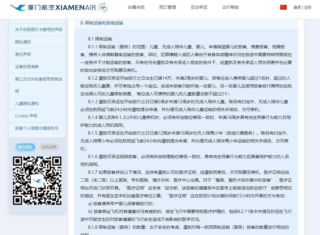 扬子晚报/紫牛新闻记者查询发现,在中国国航官网上,旅客运输总条件目录“第五条 拒绝运输和限制运输”条款中,对罹患疾病旅客无详细说明, “限制运输”中有涉及婴儿、儿童、残疾人及行动不便旅客、孕产妇、伤病及术后旅客说明;