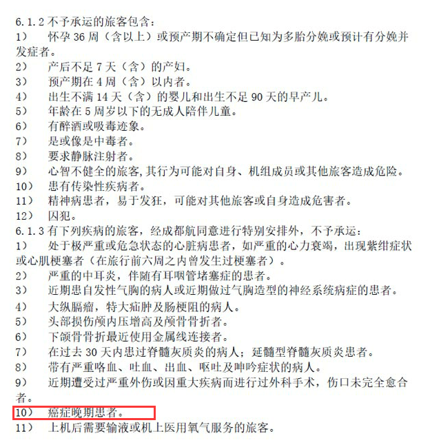 记者查询发现,《成都航空有限公司旅客、行李国内运输总条件(EU05版)》中提到,有下列疾病的旅客,经成都航空同意进行特别安排外,不予承运,其中包括“癌症晚期患者”。此外,还有11类患有疾病的旅客,经成都航空同意进行特别安排外,不予承运。