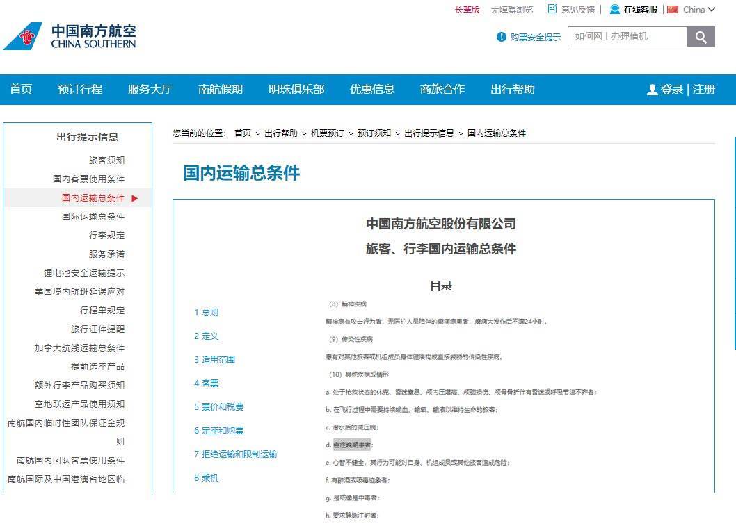 南航官网上,“拒绝运输和限制运输”条款中,有多项细则和成都航空一致,“癌症晚期患者”也在列;
