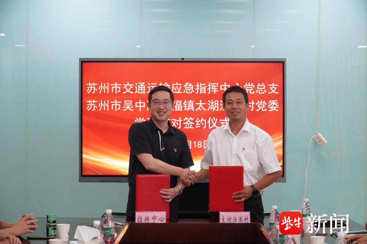 签约仪式上,苏州市吴中区光福镇太湖渔港村党委书记蒋庆东和苏州市交通运输应急指挥中心党总支委员姚俊依次介绍了各自单位的基本情况以及工作开展情况,并表示,希望以此次党建结对共建为契机,搭建资源共享平台,充分发挥双方资源优势,推动双方党建与业务工作深度融合,协同做好帮促工作,以全方位、系统化的互动,实现优势互补、资源共享、共建共荣发展新局面。随后,双方签订了党建结对共建协议书。