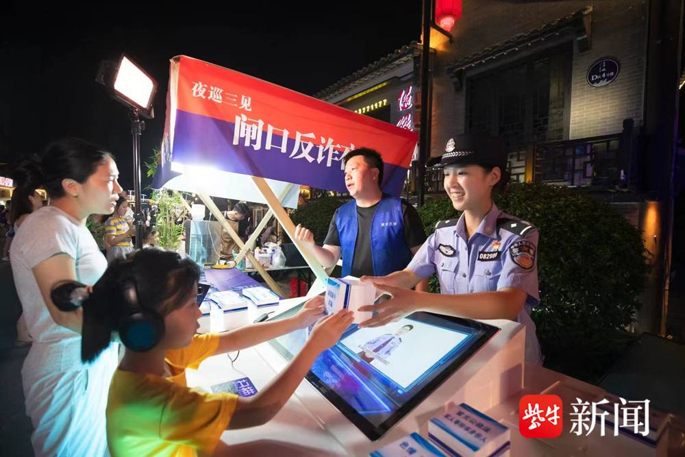 “欢迎光临反诈夜市!”8月21日晚,在淮安市大运河文化长廊景区,清江浦分局的“闸口反诈夜市”小摊在众多摊位中格外显眼。摊位上滚动播放20余类电信诈骗案例,民警现场讲解宣传反诈知识,吸引大量游客驻足了解。