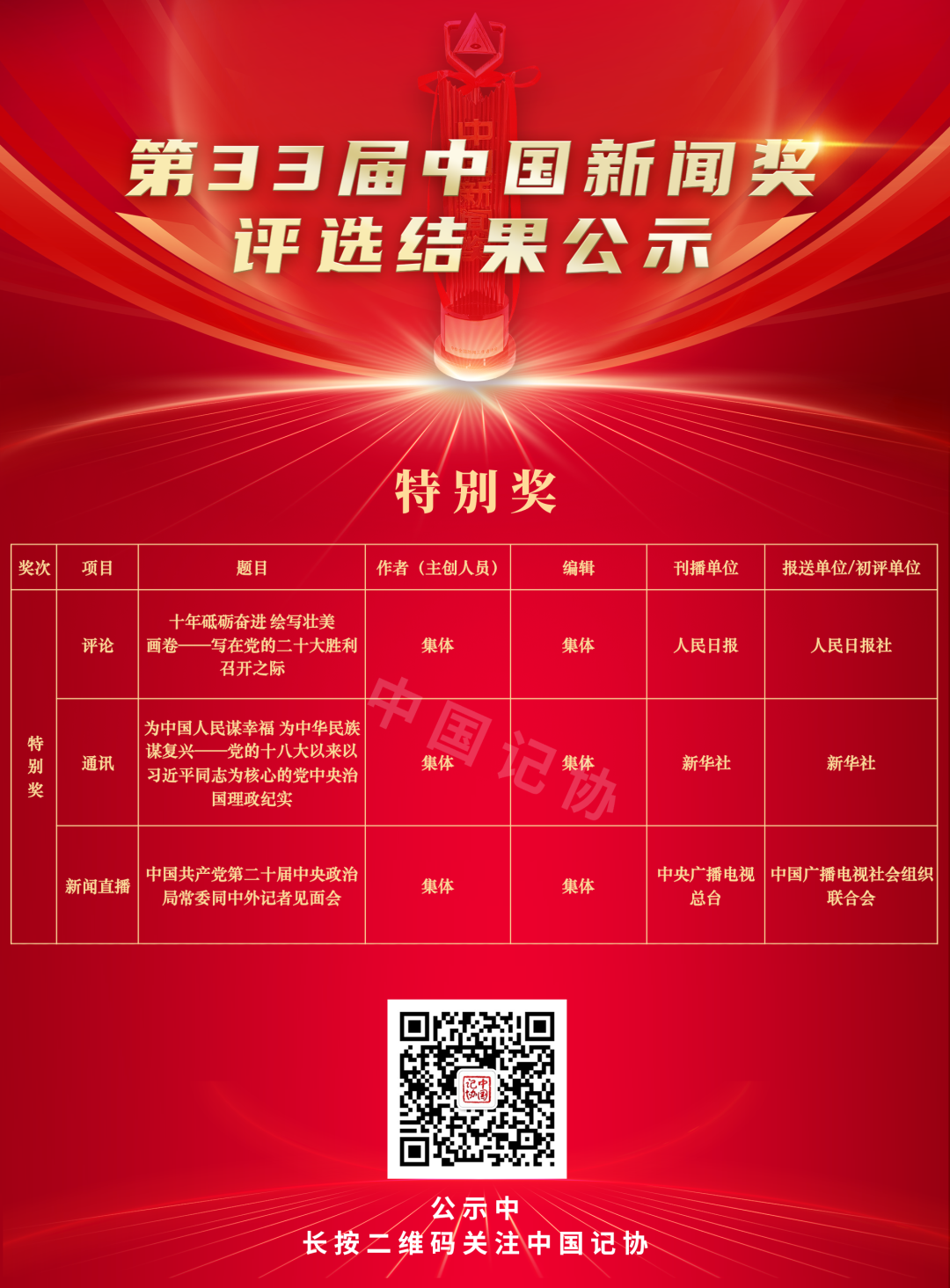 关于公示第33届中国新闻奖评选结果的公告