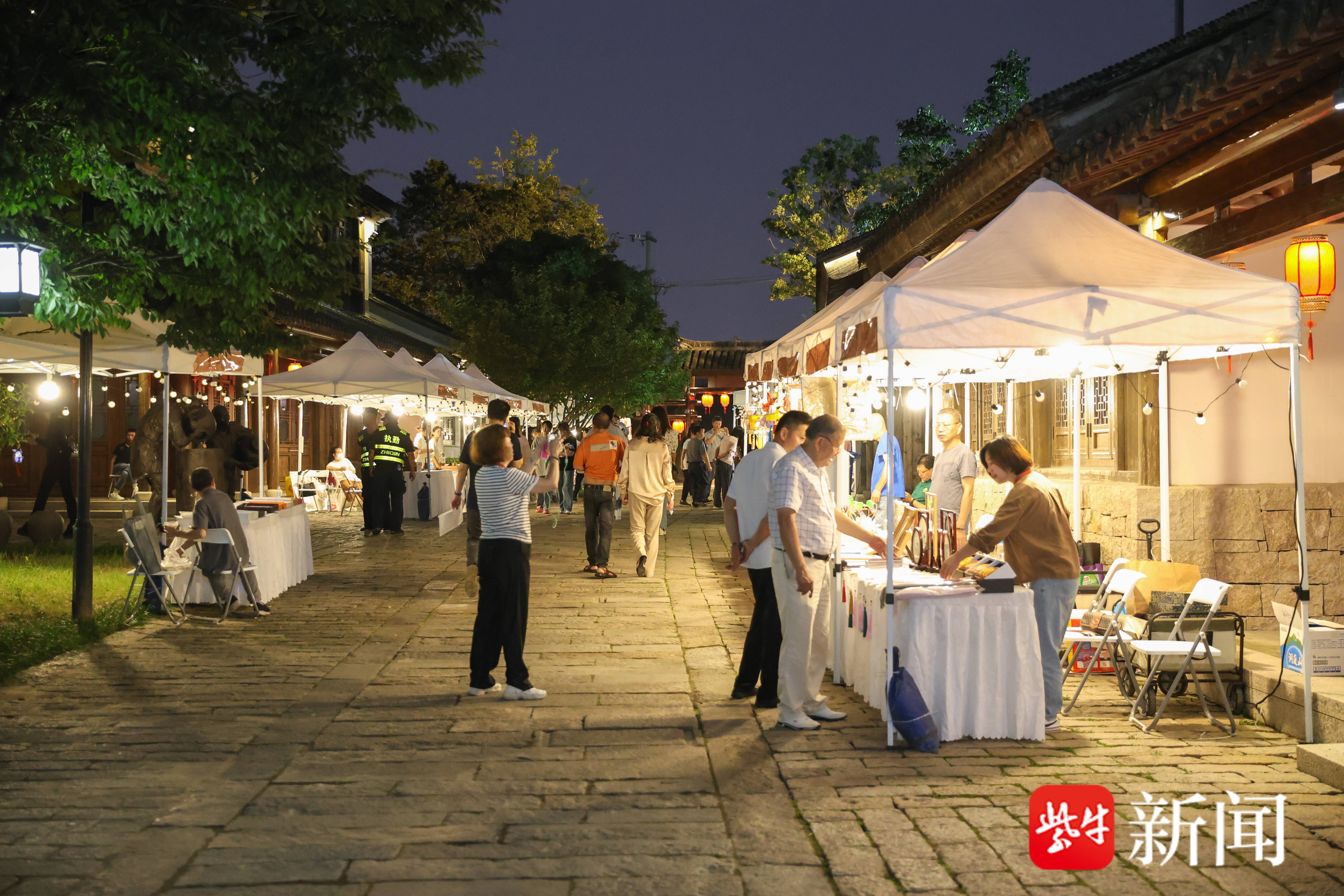 为推动“石湖串月”民俗活动走向市场,当晚,新郭老街市集开放40余个摊位,融合苏式非遗技艺、传统手工艺、现代文创产品、美食鲜花等多样化内容,集逛、吃、赏、玩于一体,让市民游客徜徉在古建筑群中,感受国潮的魅力。