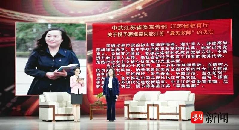 近日,中共江苏省委宣传部、江苏省教育厅授予蒋海燕江苏“最美教师”称号。“这既是鼓励也是一种莫大的动力,让我感受到平凡工作的不平凡,其实我所做的只是我的分内事。”蒋海燕表示,作为教育工作者,身上的责任是重大的,未来将不负韶华,继续无怨无悔地奔走在教书育人的这方沃土中,继续把学生放在第一位,做一名被学生和社会高度认可的老师。