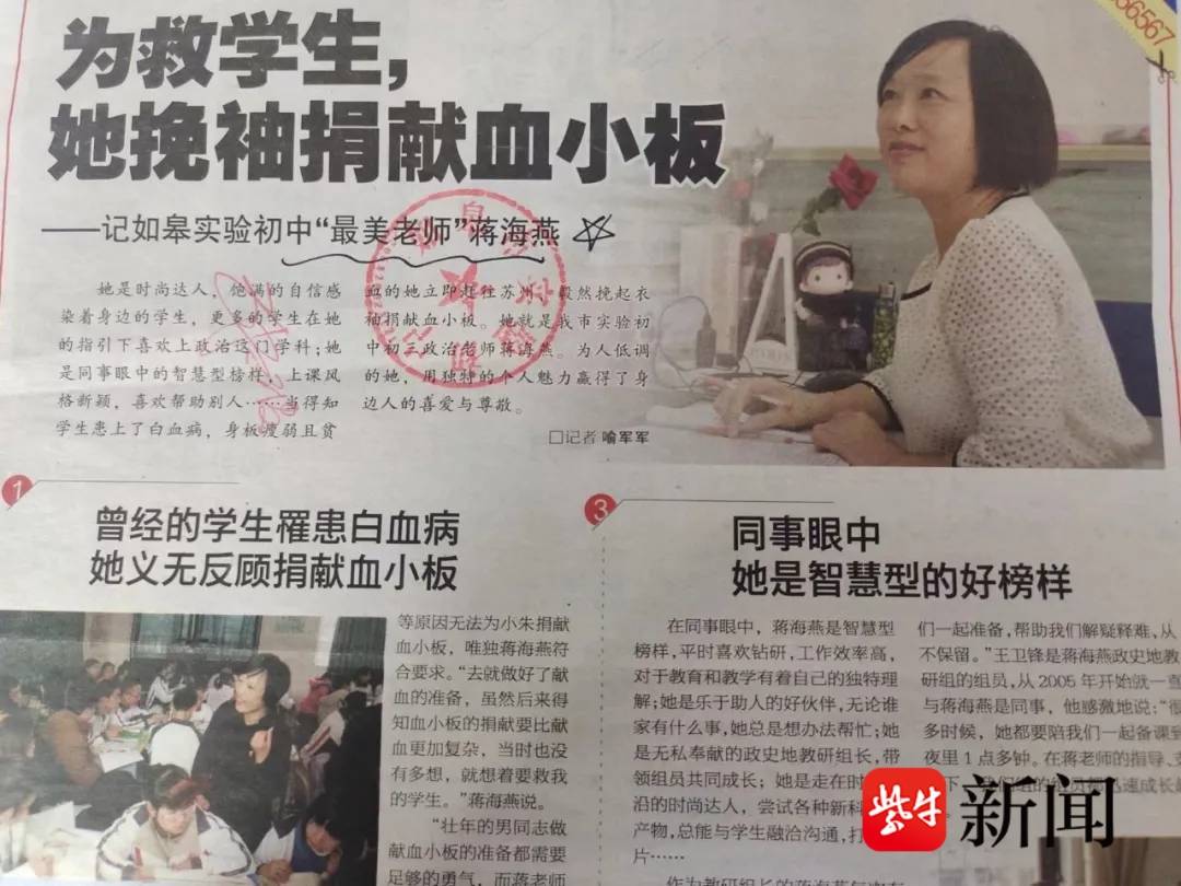 无论是课堂之上,还是课堂之外,蒋海燕都时刻关注着她的学生,做他们的“知心人”和“同行人”。2014年,蒋海燕曾经的学生小朱患上淋巴癌并引发了白血病,血小板骤减,生命垂危,急需救治。当时的蒋海燕身体瘦弱且贫血,却是唯一符合捐献要求的人。冒着生命危险,蒋海燕坚决地走进了捐献室。整个捐献过程,困难重重,在体外循环时,蒋海燕的呼吸出现了严重的问题,医生询问是否继续,想到病床上的学生,她没有丝毫犹豫,硬生生地咬牙坚持了下来,成功捐献了高浓度的血小板。