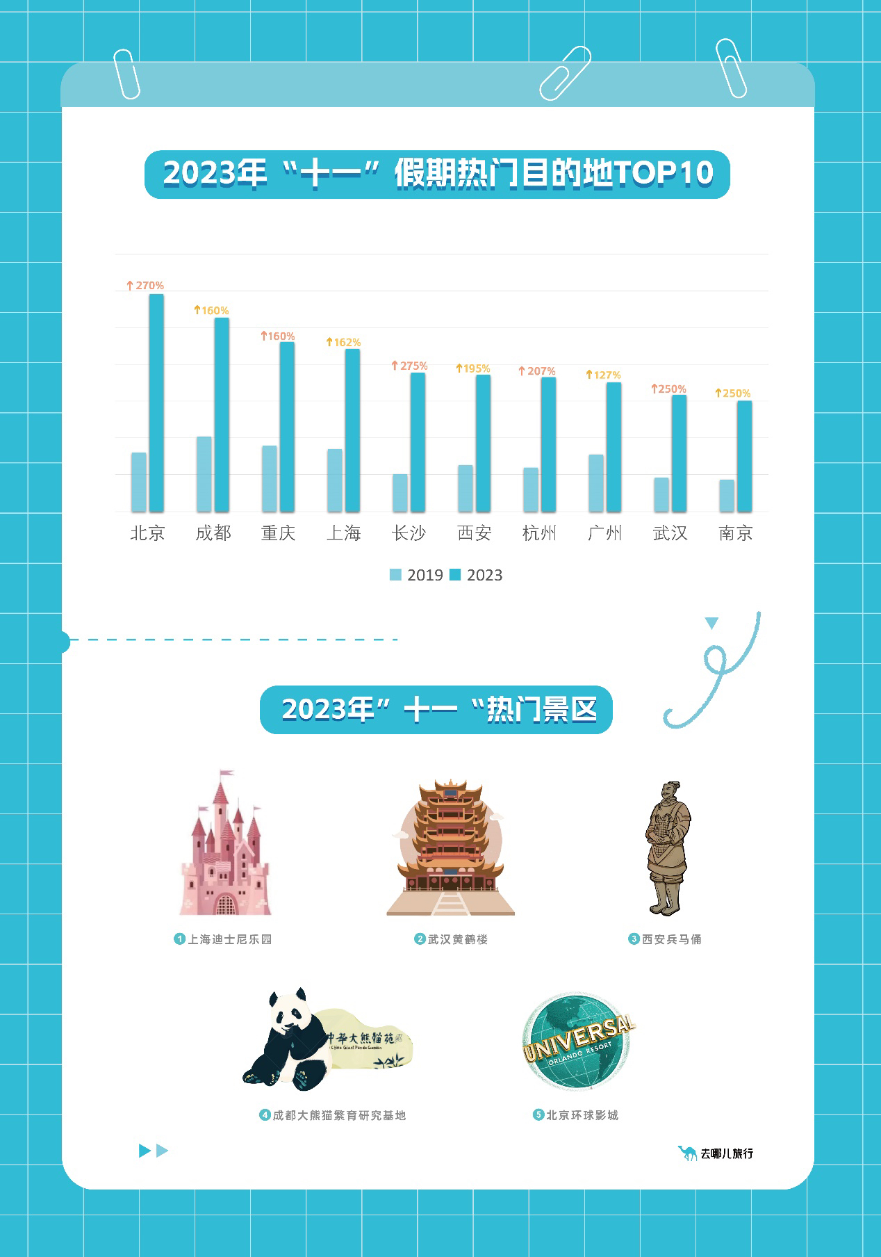 中秋、国庆组成的8天超级黄金周,让旅游消费市场热度空前高涨。去哪儿大数据显示,今年“十一”期间,国内热门城市机票预订量较疫情前增长近五成,9月29日出发的机票预订量创下历史新高。国内热门城市酒店预订量较疫情前增长2倍,热门目的地Top10为北京、成都、重庆、上海、长沙、西安、杭州、广州、武汉、南京。各目的地“必去”景区均已“爆满”,如上海迪士尼乐园、成都大熊猫繁育研究基地、西安秦始皇帝陵博物院(兵马俑)、北京环球度假区、武汉黄鹤楼等。