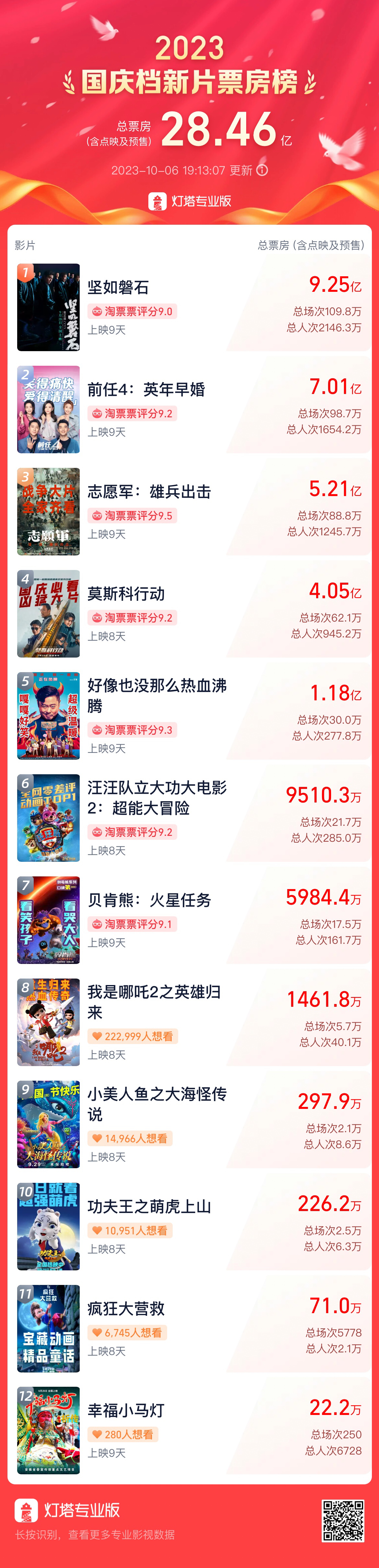 犯罪悬疑、历史战争、爱情、喜剧……今年“国庆档”影片题材很多元。排行第二、第三、第四的分别是《前任4:英年早婚》《志愿军:雄兵出击》《莫斯科行动》,成绩分别为7亿、5.21亿、4.05亿,排行第五的《好像也没那么热血沸腾》则被拉开较大差距,票房为1.18亿元。