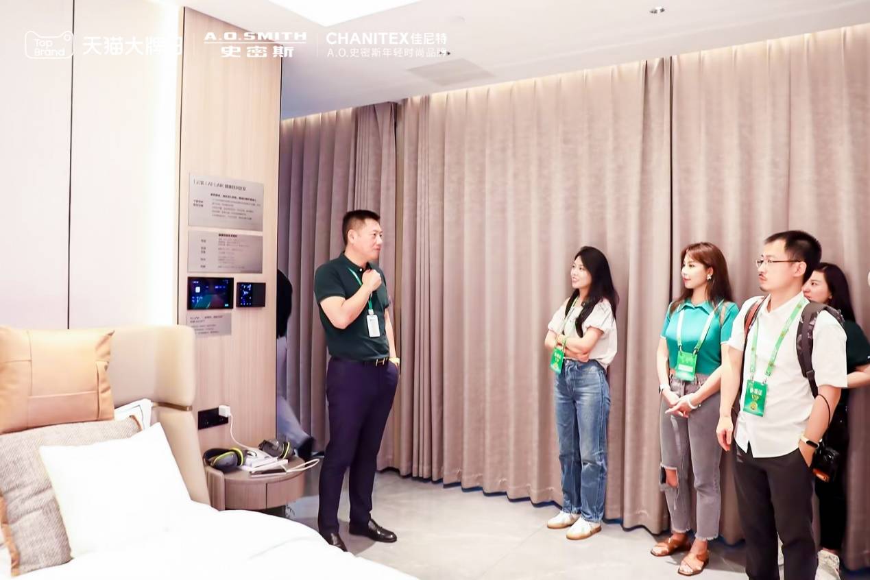 第二站,他们来到位于A.O.史密斯水系统有限公司的“好风好水健康空间”,在A.O.史密斯市场副总经理兼商用产品营销总经理张晖、南京合斯满网络科技有限公司总经理何晓冬的陪同讲解中,沉浸式感受了由AI-LiNK好风好水智慧五恒系统带来的品质家居生活,见证了A.O.史密斯如何通过自旋式洁霸洗碗机、内嵌式蒸烤一体机两大新品,协同「瀞」油烟机、橱下冷热即饮净水机,在AI-LiNK智慧互联平台的加持下,构建出洁净、健康、安全的厨房空间。
