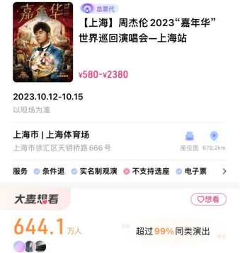 10月12日,为期四天的周杰伦上海站演唱会正式开唱。根据大麦、票星球、猫眼三个平台公布的演唱会门票数据,本次周杰伦上海演唱会共放出超11万张门票。