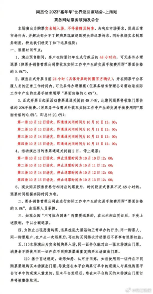 据悉,本次周杰伦演唱会为购票实名制入场,门票可退,但不得转赠及转售,演出开始前48小时停止退票。在强实名制下,入场时需要进行“人脸识别”,购票者与观演人必须一致。“强实名制”购票规则下,每张身份证仅可购买每场演出的一张门票, 门票不可转赠,但可在规定时间内退票。