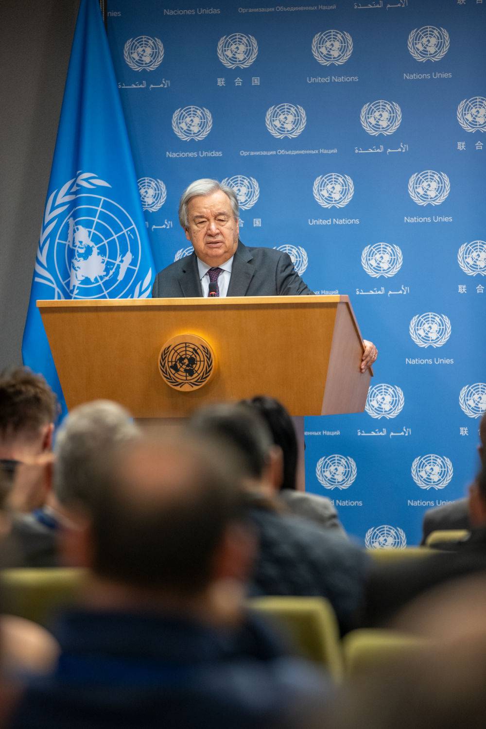 10月9日,在位于纽约的联合国总部,联合国秘书长古特雷斯在记者会上就巴以局势发表谈话。新华社发(联合国供图/保罗·菲尔盖拉斯摄)