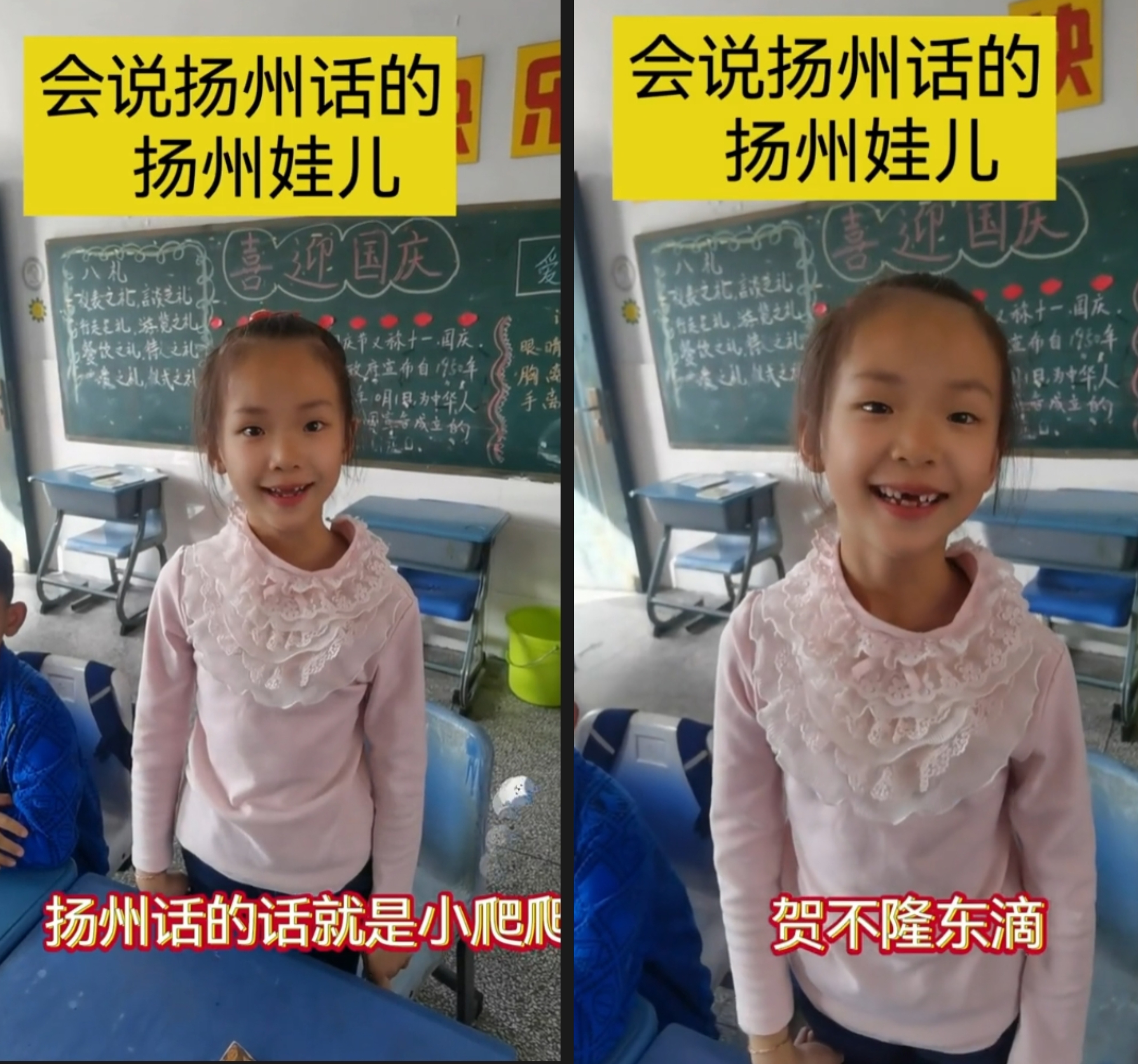 例如,南通如皋因说家乡话走红的刘泓彬如今已有465.4万粉丝,他说:“我在学校里面说普通话,我在家里面说家乡话,我喜欢我的家乡。”“不得劲、不中、你这是弄啥嘞……”一激动就飙河南话的糖果,经常被妈妈考河南话,甜甜的声音搭配接地气的方言,收获了137万粉丝。10月17日,扬州一名一年级老师发视频分享同学们对扬州话的了解和使用情况,会扬州话的小朋友说得并不是特别标准,她一一纠正: “‘黑色’叫‘贺不隆冬滴(音),普通话‘板凳’‘小凳子’在扬州话中叫‘小爬爬(音)……”