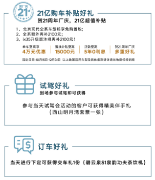 并且,10月15日至12月31日期间,北京现代全系产品畅享免购置税、全系额外再补2100元、ix35升级版沐飒再补2100元!除此之外,更有单车至高享4万元优惠、置换补贴至高享15000元、贷款至高享5年0利息等多重豪礼。