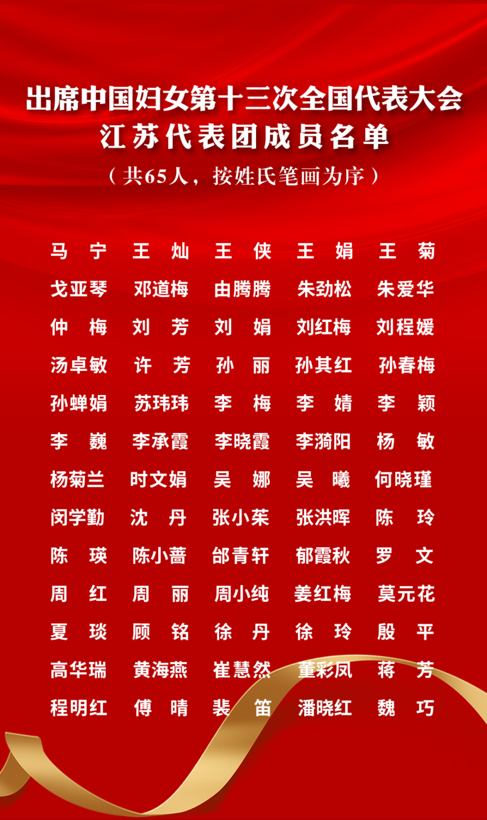 中国妇女十三大江苏代表团共65人,其中来自各族各界各行各业劳动妇女和知识女性中的优秀代表超过70%。代表中既有助力高水平科技自立自强的女科学家、高校科研院所工作者,坚守实体经济、助力构建现代化产业体系的女企业家、女性创业者,乡村振兴领域的新时代新农人;也有从事妇女儿童家庭关爱服务的社会组织负责人,弘扬优秀传统文化、非遗技艺的传承人,新业态新就业群体代表;还有教育、交通运输、海关、税务、农信联社等行业系统的优秀女性,体现了高度的政治性、鲜明的先进性、广泛的群众性。