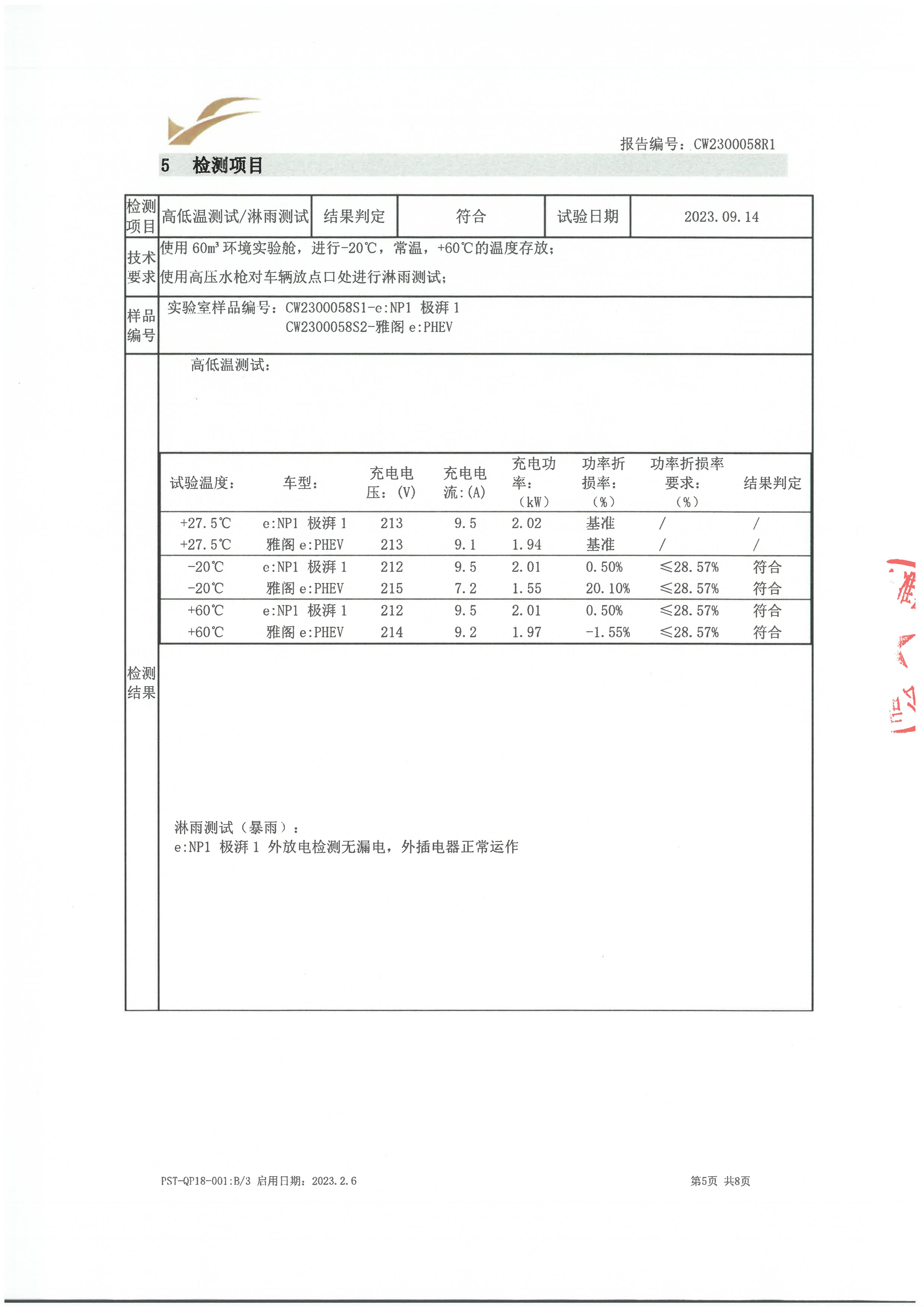 在整车气候模拟环境箱中,无论是零下20摄氏度的低温充电测试,还是在60摄氏度的高温测试,亦或是暴雨直淋放电,e:NP1极湃1充电的电压和电流始终保持稳定,且极端天气下的充、放电也没有发生任何的短路和断电现象。雅阁e:PHEV(插电混动)在零下20度到60度的极低或极高温度中,同样凭借完善的动力电池管理系统,充电功率保持良好。