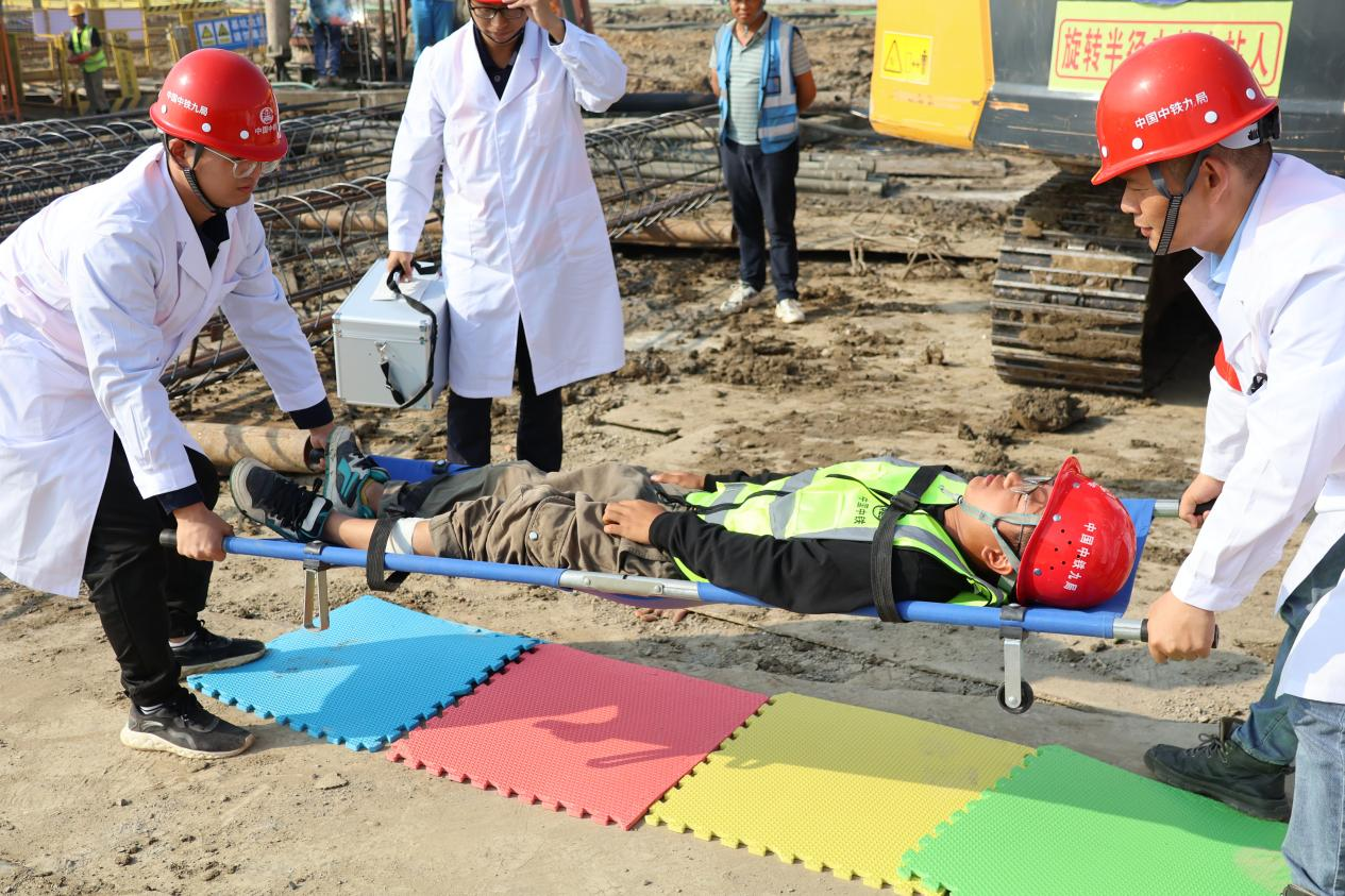 此次演练内容为模拟施工现场桩机移位倾覆引发人员伤情以及施工现场配电箱着火引起火情等突发情况。同时精确模拟事故发生后组织指挥、事故响应、事故救援、现场警戒等应急救援全过程。