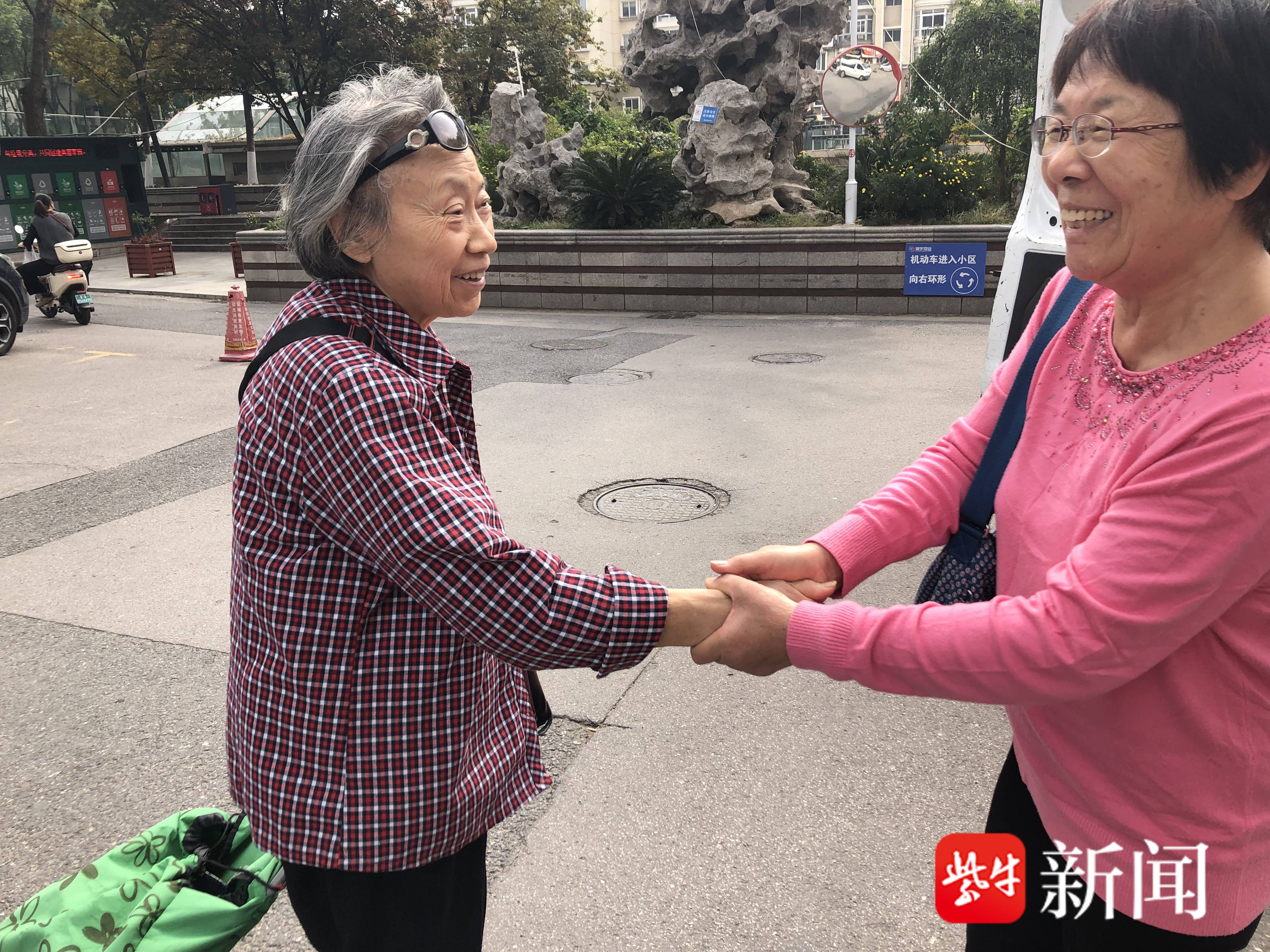尹桂华(右)和偶遇的邻居聊家常