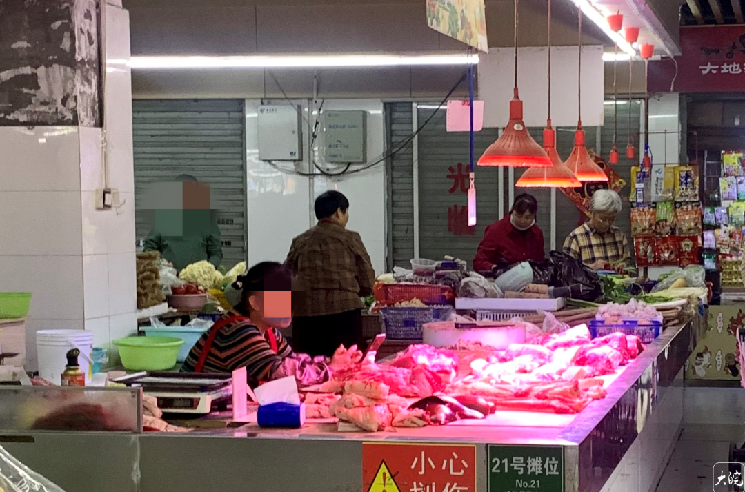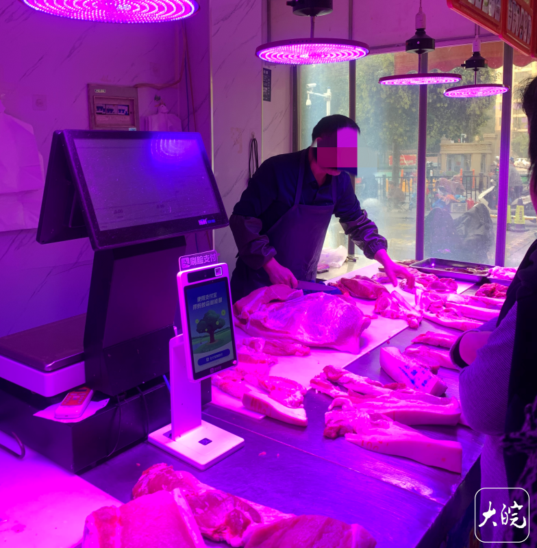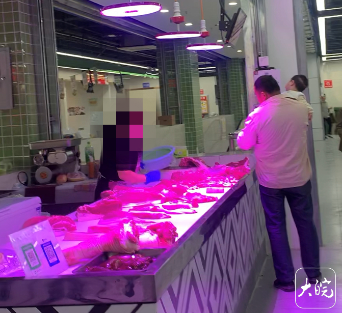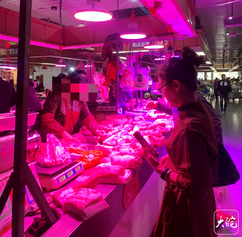 “我们以前在其他地方买菜时候都没注意看有这些生鲜灯,也没注意生鲜灯照射下,肉的颜色不一样。”梁女士告诉大皖新闻记者,10月上旬,她在前往凌大塘菜市场买菜时,看到一家猪肉摊上的肉挺新鲜的。“我当时也是有事,也看到上面有那种红色的灯照着,但是没怎么在意,就选了一块猪前腿肉付了钱。”