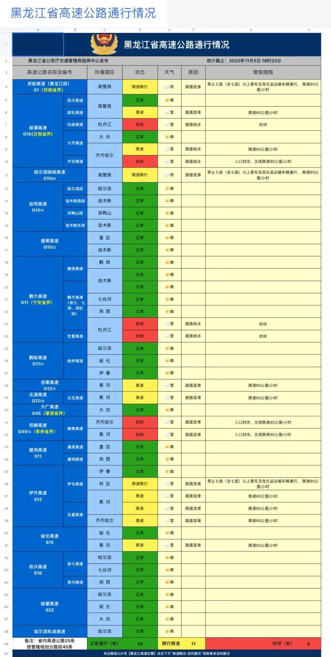 黑龙江省内6条高速封闭、11条高速限速限行